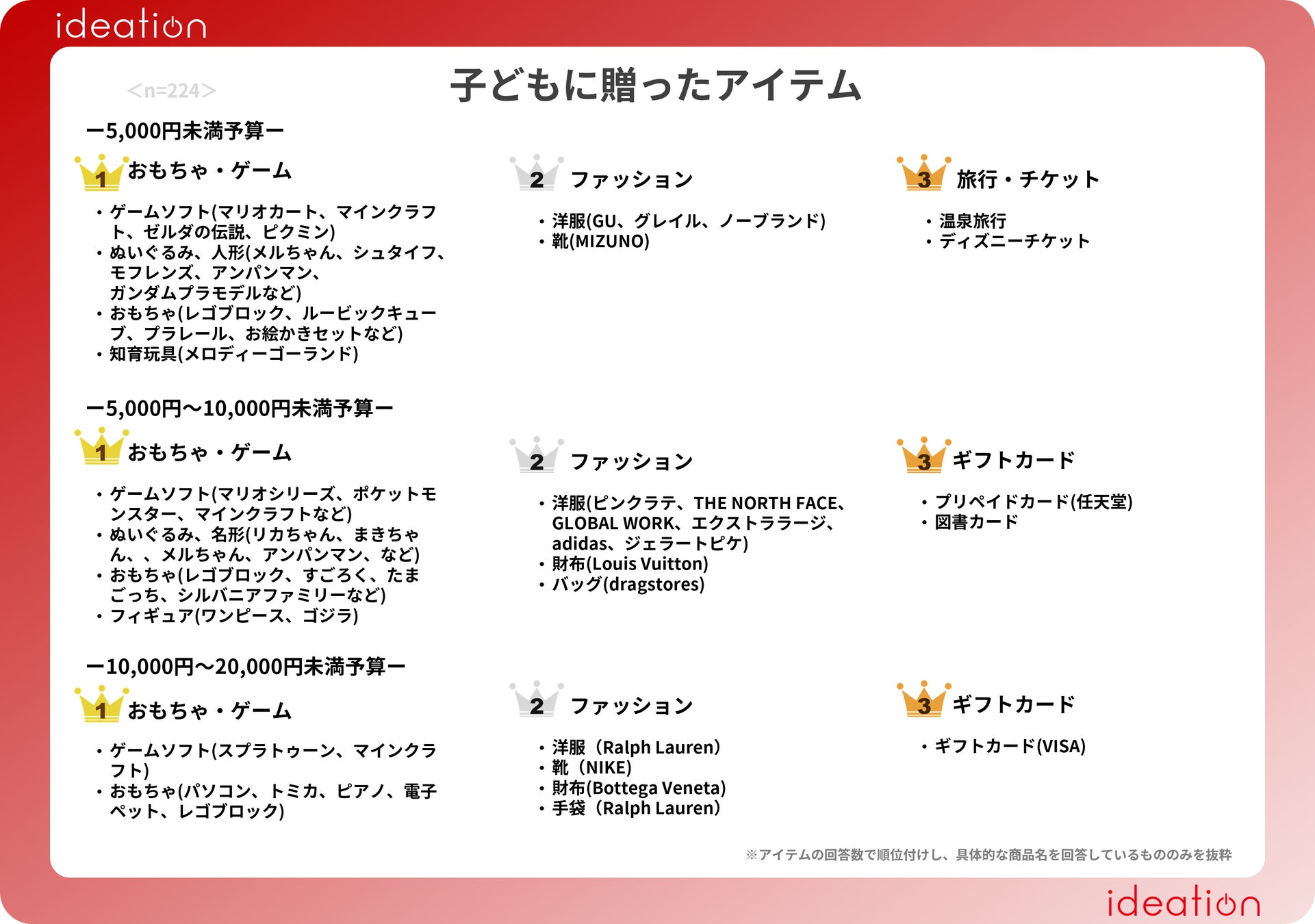 最後に、「子ども」に贈ったアイテムについても調べました。