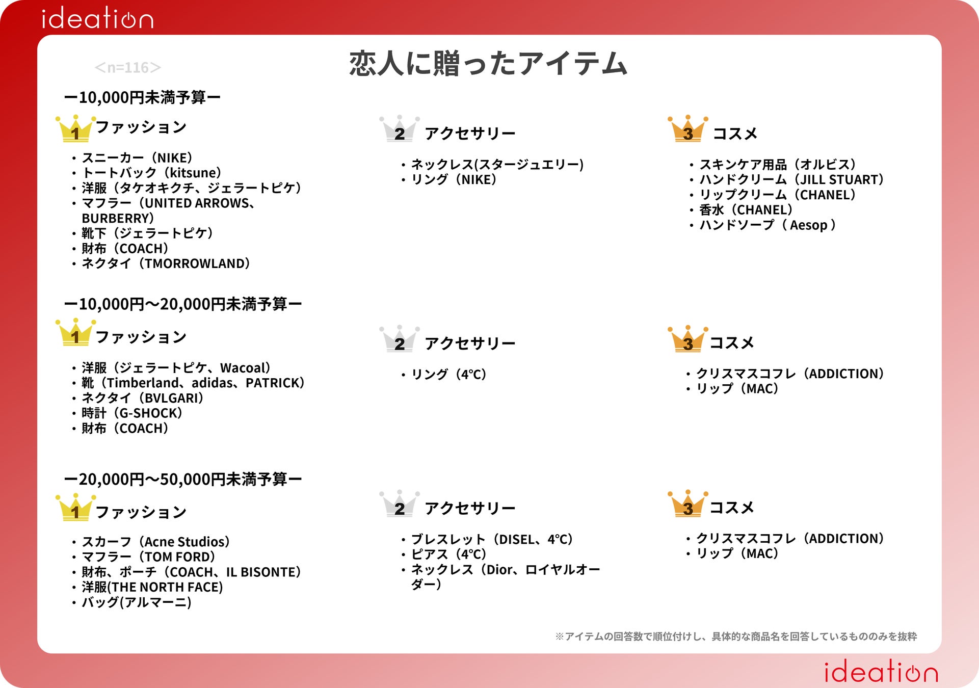 実際に贈ったアイテムを相手別で見ても、「恋人」には洋服や財布などファッション関連のプレゼントを贈ったとの声が多いのに対し、「同性の友人」へのプレゼントでは、コスメや食品・飲料など気軽に渡せるプレゼントを選ぶ人も多いようです。