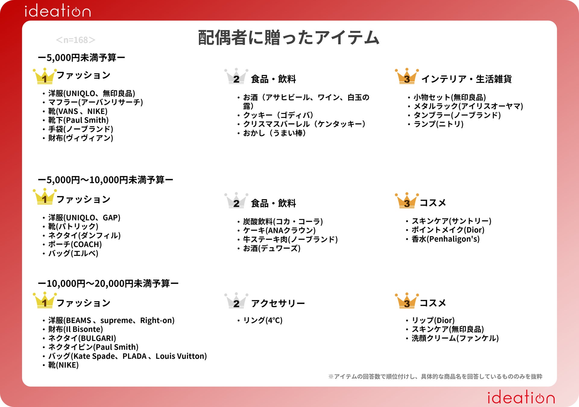 「配偶者」に贈ったアイテムについても、「恋人」に贈ったアイテムと同様、予算にかかわらず「ファッション」が1位という結果となりました。また、「配偶者」へのプレゼントの予算として割合の多かった「5,000円未満」「5,000円~10,000円未満」で選ぶプレゼントとしては、「食品・飲料」が2位に選ばれており、家族で一緒に楽しめるものを贈るという傾向も見られました。