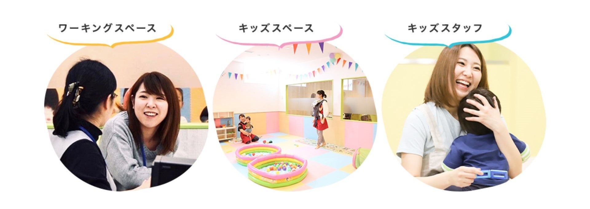 子育て中のスタッフが未就学児の子どもと一緒に出勤し、ガラス越しにキッズスペースが見えるワーキングスペースで勤務します。キッズスペースでは専任のスタッフがお子さんを見守り、遊びのサポートを行います。保育園でも在宅勤務でもない新しい働き方として、2018年にクリエアナブキ本社内に開設しました。