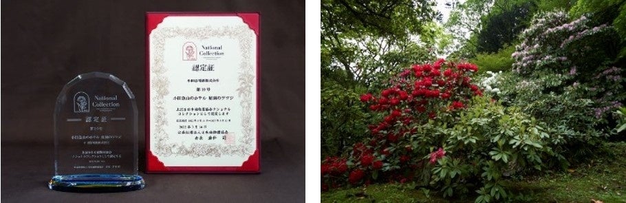 (左)ツツジ認定時の日本植物園協会 ナショナルコレクション認定証と認定盾