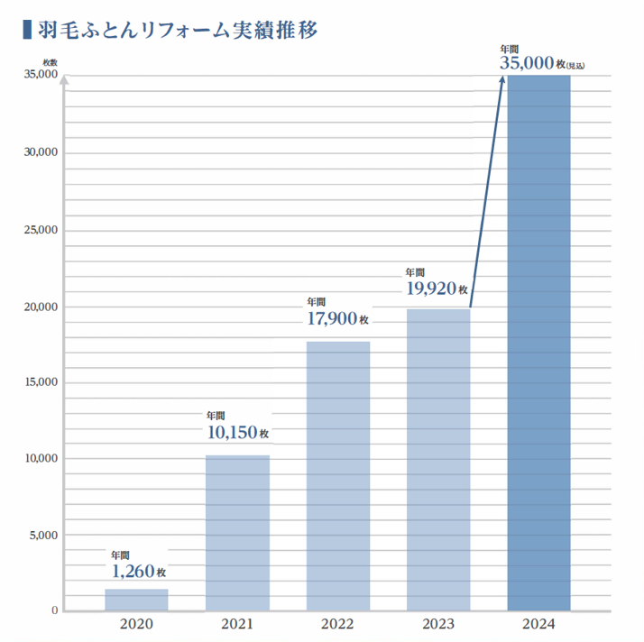 昭和西川株式会社では以前より羽毛ふとんのリフォームを行ってまいりましたが、テレビの通販番組で羽毛ふとんリフォームを紹介したところ依頼が急増しています。2020年では羽毛ふとんリフォーム枚数が1,260枚だったのに対し、放送翌年の2021年は1万150枚、2022年は1万7,900枚、2023年は1万9,920枚と4年で15.8倍に増加しています。(2024年は3万5,000枚見込み)