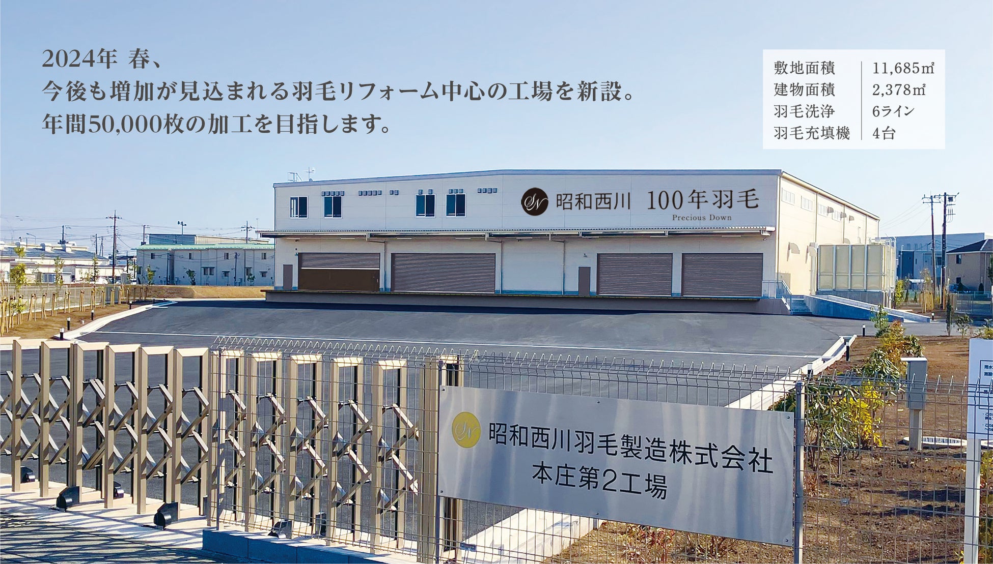 昭和西川株式会社では、急増する羽毛ふとんリフォームに対応するため、埼玉県本庄市にリフォーム専用の工場を新設しました。敷地面積1万1,685㎡、建築面積2,378㎡、延床面積3,933㎡で、6つの羽毛洗浄ラインと4台の羽毛充填機を有します。工場の新設に辺り、今後は年間5万枚の加工を目指します。