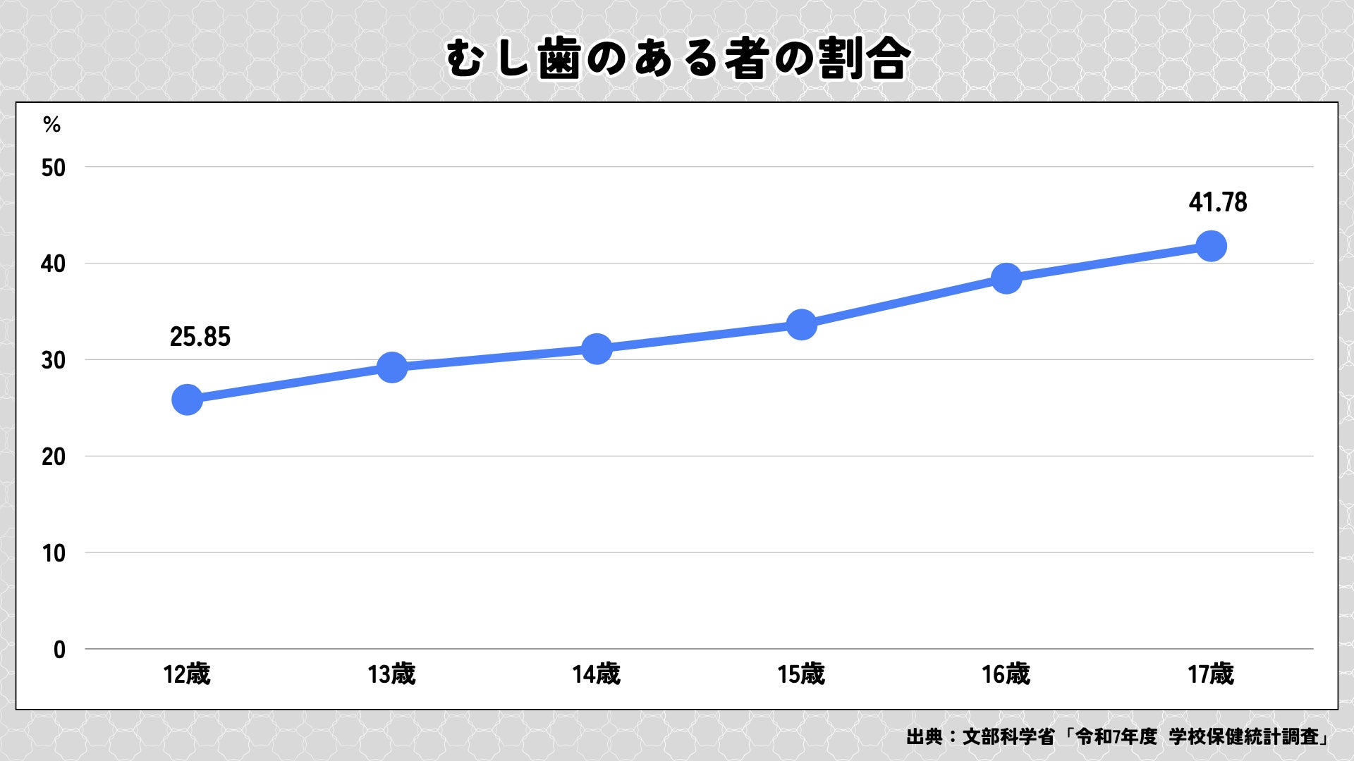 近年フッ化物の普及などにより、むし歯を経験する子どもは減少傾向にあります。しかし文部科学省の学校保健統計調査で、むし歯のある12歳と17歳の割合を比較すると1.6倍に。特に中学生や高校生は、生活環境の変化により“むし歯リスクが一気に高まる時期”であることが示されています。
