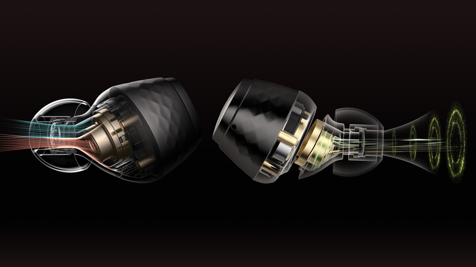 Engine 4では、物理的なクロスオーバーと電子回路によるクロスオーバーを組み合わせた独自開発の「デュアルクロスオーバー技術」を採用しています。 物理的なクロスオーバーでは、低域と高域それぞれに独立した音導管を割り当てることで、 分割されている周波数帯域間の違和感低減とスムーズな音調を実現しました。電子回路クロ スオーバー技術は、演算により高・中・低の各音域をバランスよく分離します。 ハードウェアとソフトウェアという異なるアプローチを活用したクロスオーバー技術と、新開発の振動板を組み合わせることで、分離感を維持しながらも一貫性のある、クリアーで滑らかな音を実現しています。