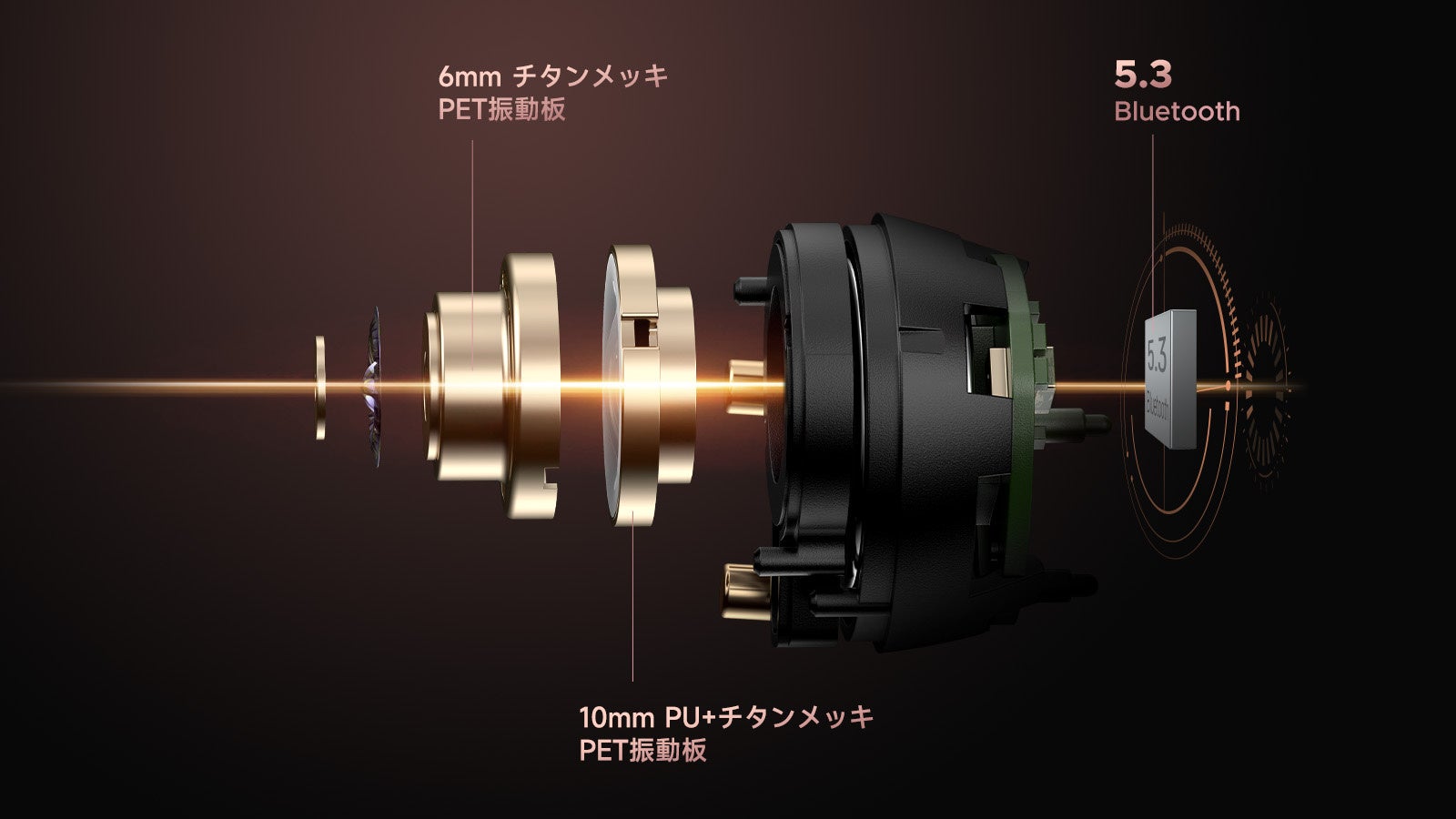 Engine 4の同軸・デュアルダイナミック型ドライバーは、PUにチタンメッキを施した3層構造からなるφ10mmPET複合振動板と、同じくチタンメッキを施したφ6mmのPET振動板で構成されます。設計にあたり徹底して素材を吟味し、柔軟性と反発力に優れたPET素材に高硬度のチタンを組み合わせることで、力強く迫力がある低域と見通しよくクリアで明るい中高域を実現しました。