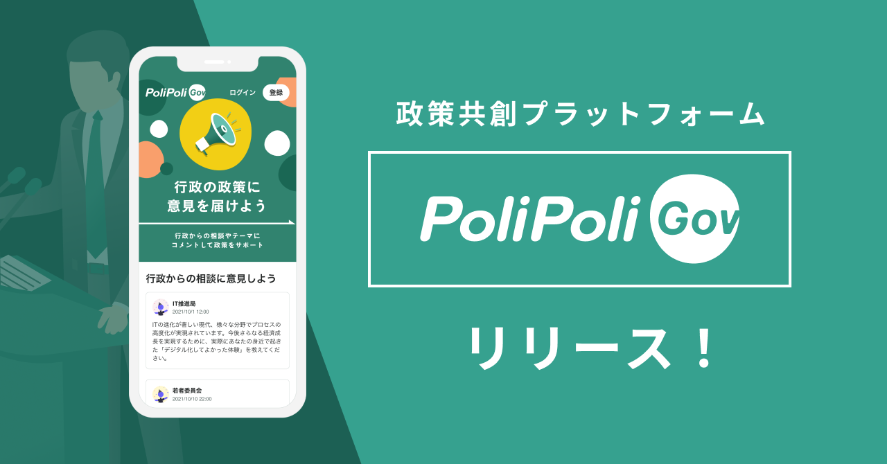 事業内容:政治家向け政策共創プラットフォーム「PoliPoli」の運営・開発、行政向け政策共創プラットフォーム「PoliPoli Gov」の運営・開発HP :https://www.polipoli.work/