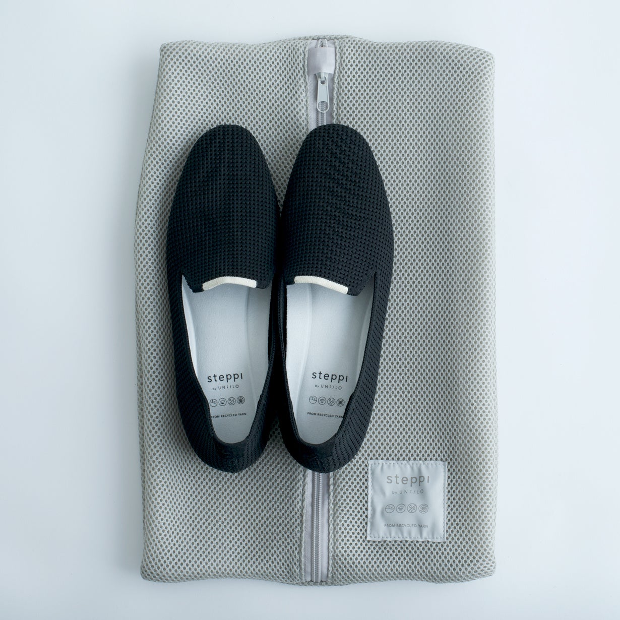 軽量リサイクルポリエステルヤーンでしなやかに編みたてることで裏材や芯材を排除しました。毎日の足取りを軽快にサポートします。
