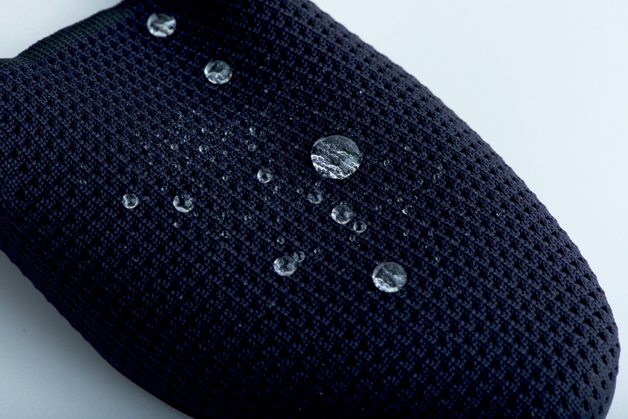 ニットでありながら撥水。ニットの糸自体に撥水加工を施しているので水を玉のようにはじきます。シーンを選ばずお出かけの場所も広がります。