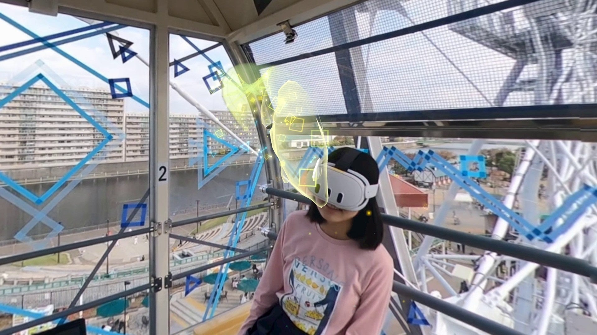 XR観覧車はVR/AR/MRといった最新のXR技術を活用し、観覧車で新しいエンターテインメント体験を提供するコンテンツです。ゴンドラに搭乗する際にMRヘッドセット「Meta Quest3」を装着することで、観覧車からの雄大な景色を楽しみながら、現実の風景をCG映像を融合させた新しいエンターテインメントを体験できます。