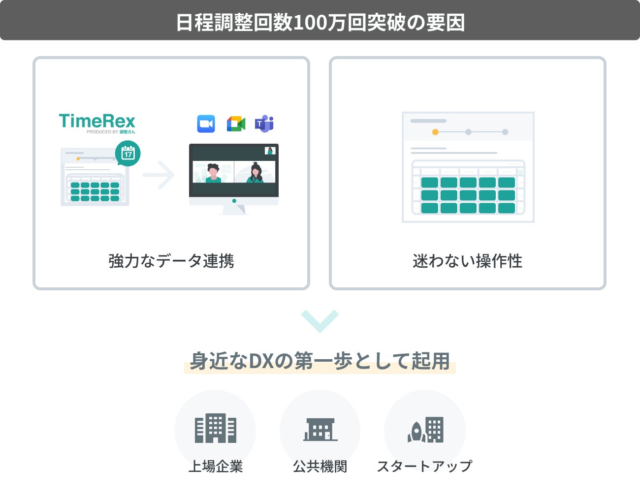 TimeRexは⽇程調整の煩わしさで悩むすべてのビジネスパーソンのための、⽇程調整⾃動化ツールです。2020年1月にTimeRexをリリースしてから約2年半で、TimeRexを使った累計日程調整回数は100万回を突破。