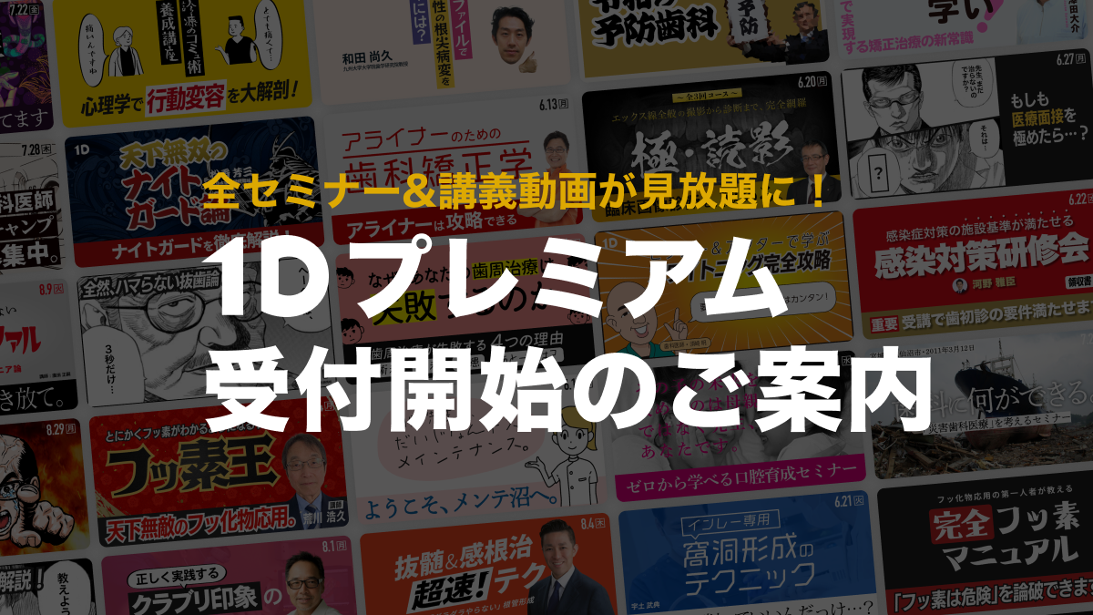 日本最大級の歯科医療メディア『1D(https://oned.jp/ )』を運営するワンディー株式会社(本社:東京都千代田区、代表取締役:松岡 周吾、康 裕三)は、月額定額で歯科医療者向けのセミナーや講義動画が見放題になる新サービス「1Dプレミアム」を発表いたしました。