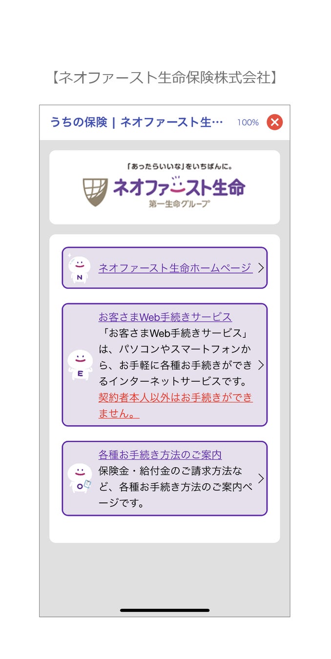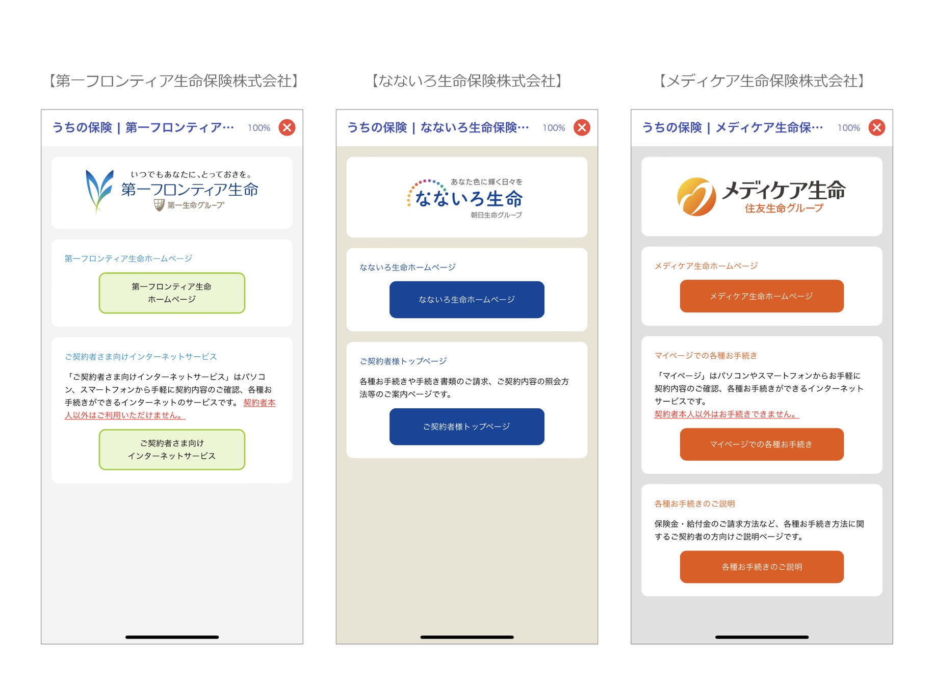 今回、協議会参加会社のうち、第一フロンティア生命保険株式会社、なないろ生命保険株式会社、メディケア生命保険株式会社(五十音順・敬称略)などがトライアル利用を開始し、既に正式利用頂いているネオファースト生命保険株式会社と合わせて、複数の保険会社について、各HPやサービスページ等へ遷移できる専用ページをうちの保険に追加実装しました。