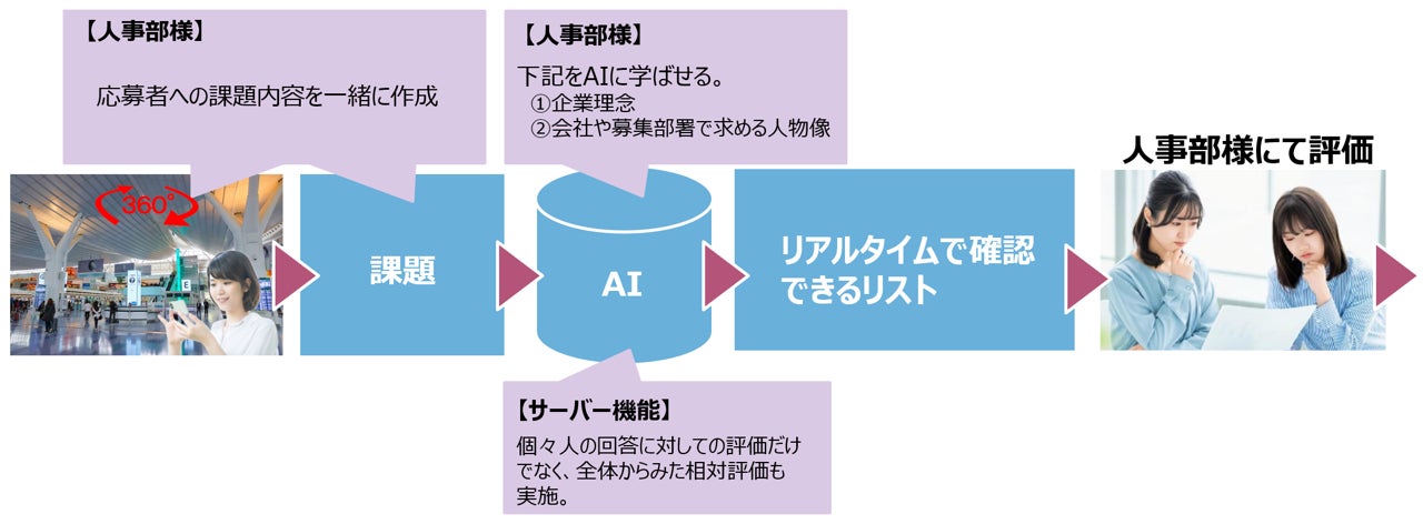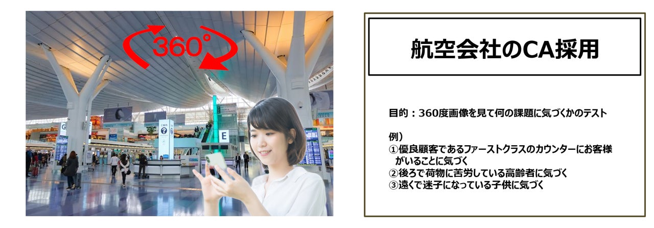 CAは現場での対応力や気付く力を求められる仕事です。そこで、応募者にはある空港のチェックインカウンターの360度空間オンラインで入ってもらいそこでの気づきを審査に入れました。ある応募者は「迷子になり泣いている子供」を見つけ、またある応募者は「大荷物に苦労している高齢者」や「チェックインカウンターに並んでいる人」に気づきました。どれが正解はありませんが、どれに気づくのか、どこから対応するのかで人物評価を実施。面接でもこの時の360度の話から入るのでより具体的な人物評価が実施できました。また、「迷子で泣いている泣いている子供」に気づく人ばかりでなく相対的にいろいろなタイプでの優秀者を採用することにより偏った採用をなくすことも実現いたしました。