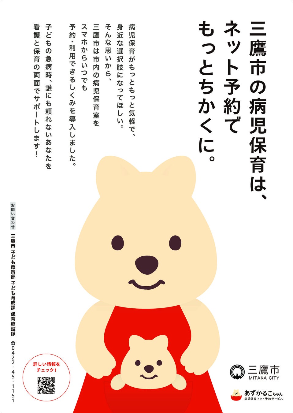 また、本取り組みと病児保育事業自体の周知強化を目的としたパンフレットやポスターを制作し、三鷹市内の保育園等で配布、掲示を行います。病児保育の利用、運営、啓蒙にあずかるこちゃんが力になれるよう、今後もサービス提供を推進していきます。