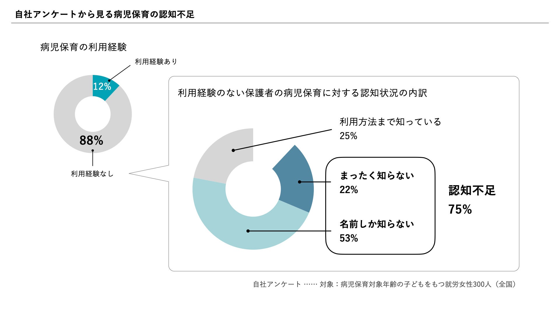 弊社が全国の子どもを持つ就労女性300人にアンケートを行ったところ、「病児保育の利用経験がない」と答えた方は88%にのぼりました。さらに病児保育を利用したことがない方に、病児保育について知っているか聞くと、75%が「知らない」もしくは「名前しか知らない」と回答しました。また、アンケート結果から、手続きの煩雑さが利用を遠ざけているということも分かりました。