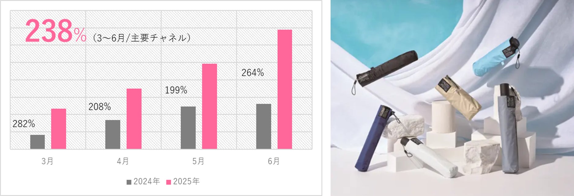 『マジカルテック プロテクション』は、世界最軽量級の軽さと遮光率・UVカット率100%の高性能を両立した晴雨兼用傘です。特に2025年3〜6月には、主要販売チャネルで、前年同月比238%という大幅な売上増を記録。UV対策ニーズや、晴雨兼用かつ軽量という実用性による男性ユーザーの新規獲得も伸長の要因となっています。