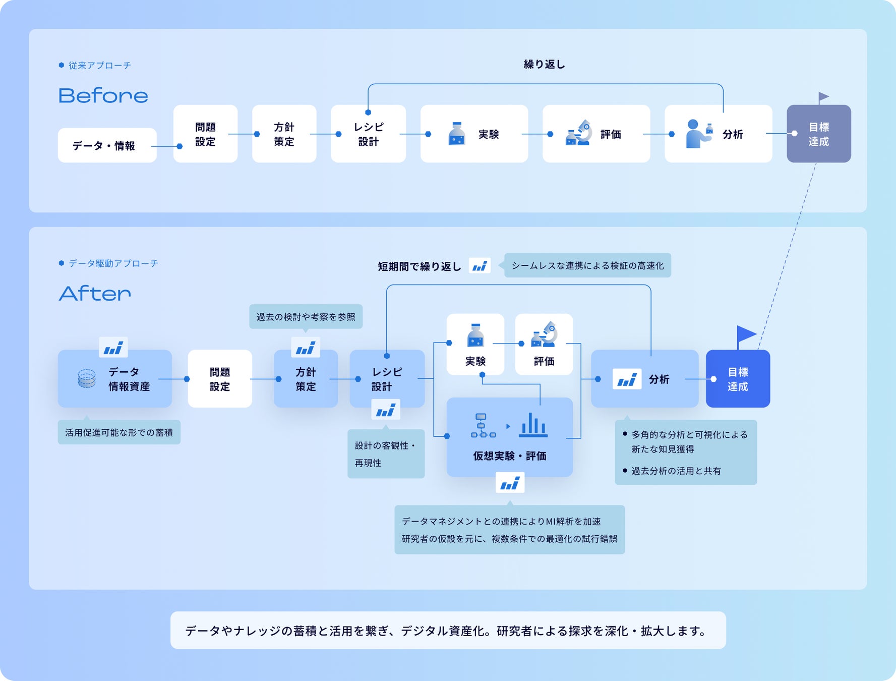 現代の研究開発現場では、高度化する要求性能、短期化する開発サイクル、そして激化する競争に対応するため、従来の手法を超える効率性と柔軟性が求められています。また、データの膨大化と複雑化に伴い、データ資産を効果的に蓄積し、活用することがますます重要になっています。