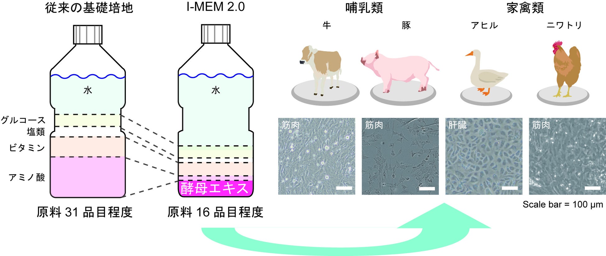 今回、インテグリカルチャーが持つ細胞性食品に関する知見と、JT加工食品事業の研究部門であるテーブルマークの食品総合研究所が、これまで培った食品用酵母に関する製造・応用活用の技術に加え、細胞培養への食品酵母活用の知見を組み合わせた共同研究により、「I-MEM2.0」の開発に成功しました。「I-MEM2.0」は、ウシ筋肉由来細胞をはじめ、アヒル肝臓由来細胞、ニワトリの5つの臓器(筋肉、肝臓、腎臓、肺、脳)由来細胞の初代細胞(※3)のほか、ラット由来肝上皮細胞(※4)(RL34細胞)などの株化細胞(※5)の培養が可能であり、特定の細胞種に限定せず、細胞農業用の基礎培地として幅広い活用が期待できます。「I-MEM2.0」は現在、特許を出願中であり、近年中に製品販売を予定しています。