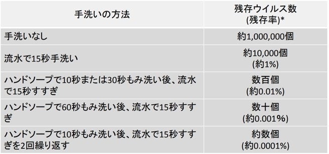 厚生労働省の発表によると、手洗い時間と回数によって下記表のとおりウイルスの残存率が飛躍的に変化する事が報告されております。