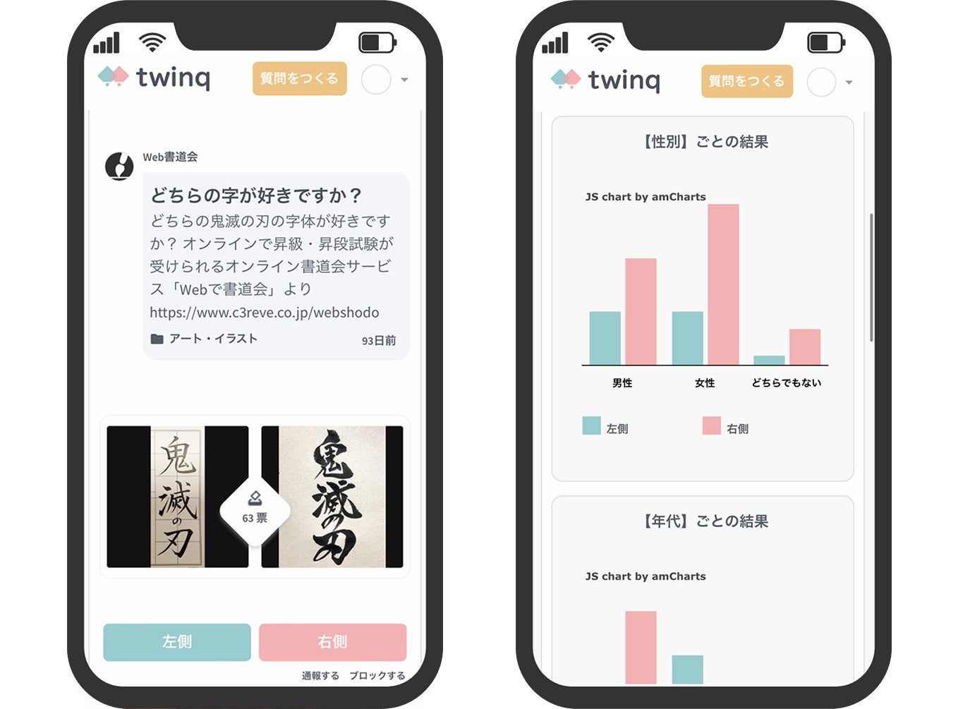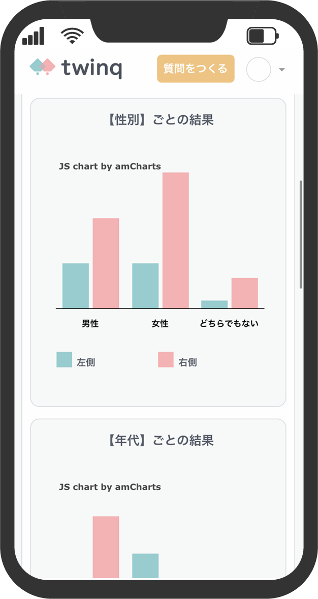 さらにツインクだけの機能として、マイページで年代や職業、地域、年収などを設定することができ、投票結果ページでは各項目毎にグラフでの比較ができるため、より細かな分析を簡単に行うことができます。