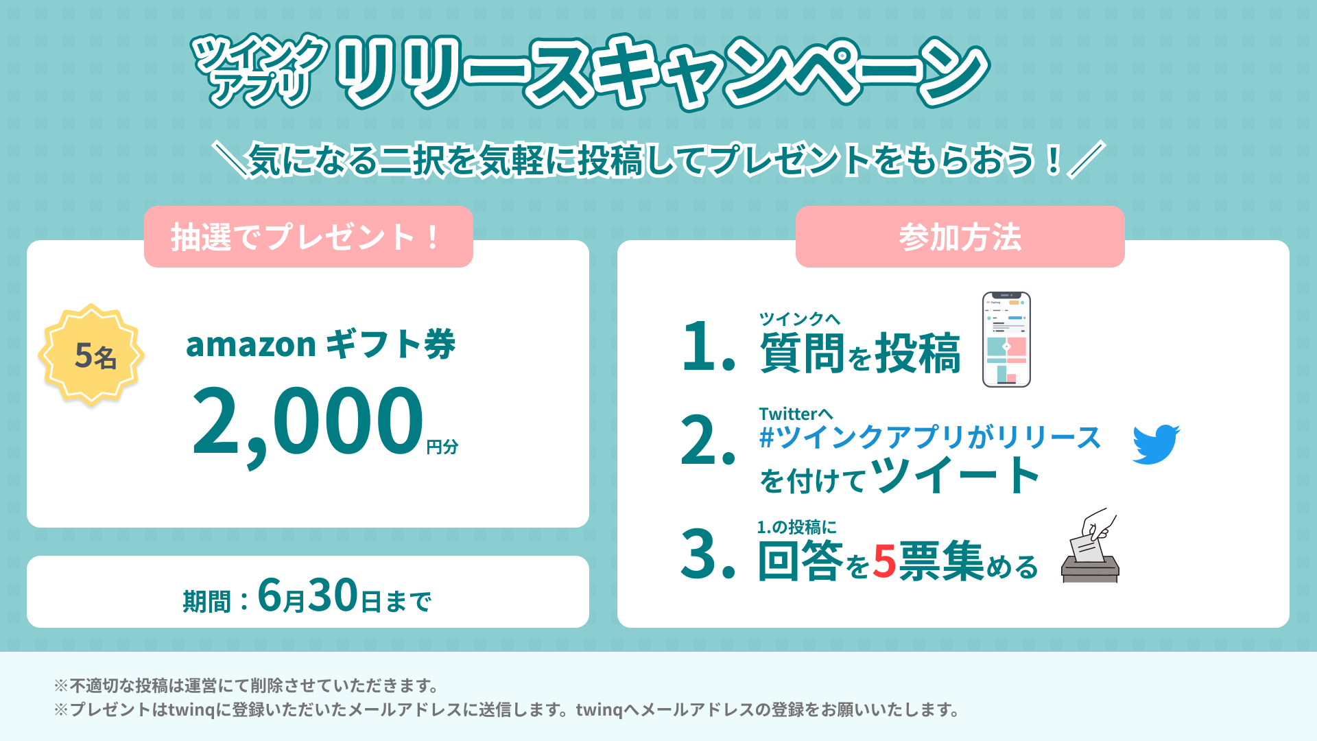 スマホアプリリリースを記念して、ツインクに投稿すると抽選で5名様にアマゾンギフト券2000円分があたるキャンペーンを実施中。