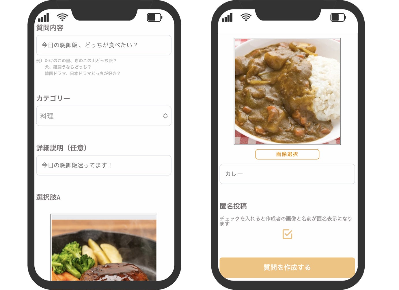 ①質問内容を決めて画像を2つ選ぶ。