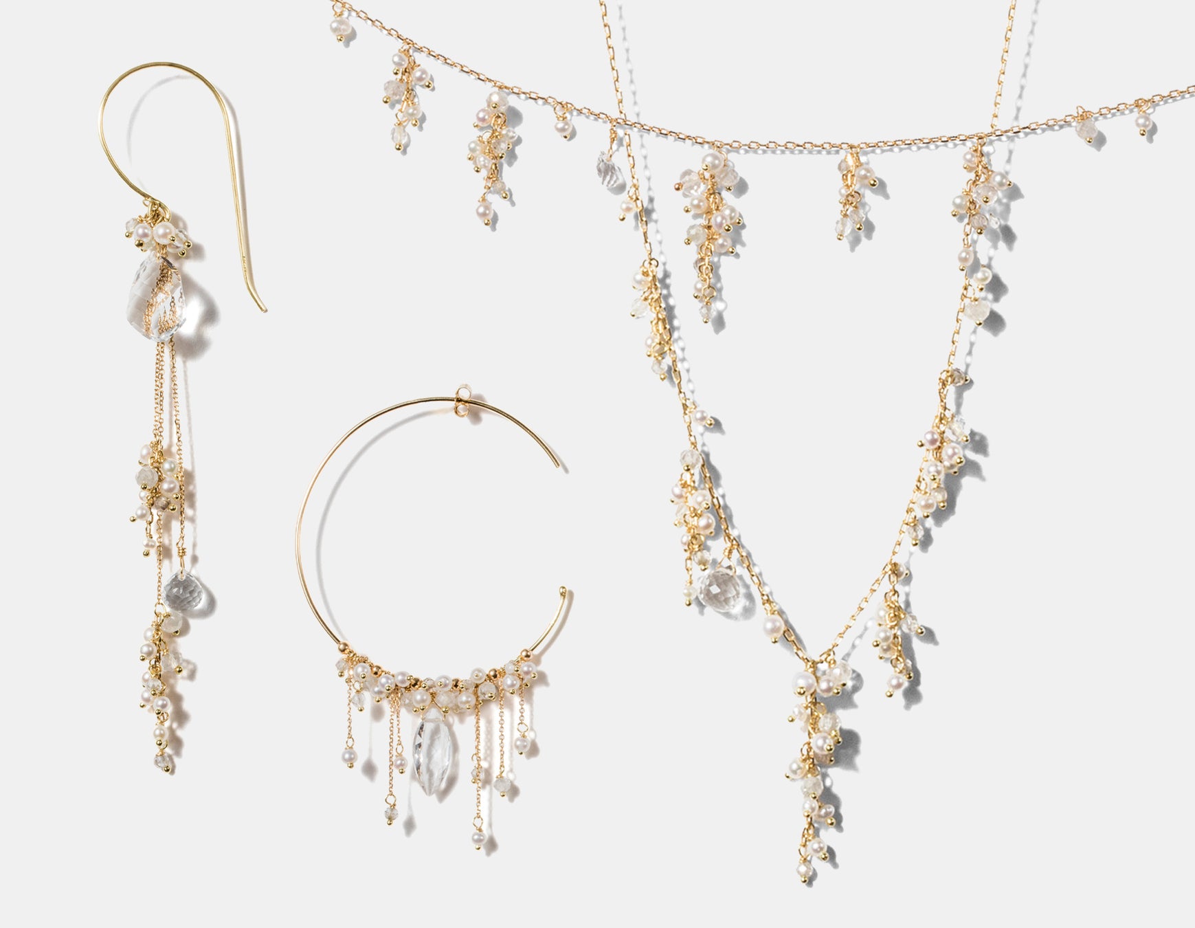 from left)Pierce¥132,000 ¥176,000 Bracelet¥165,000 Necklace¥223,300(全て税込)/18KYG、Crystal、Pearl、Zircon