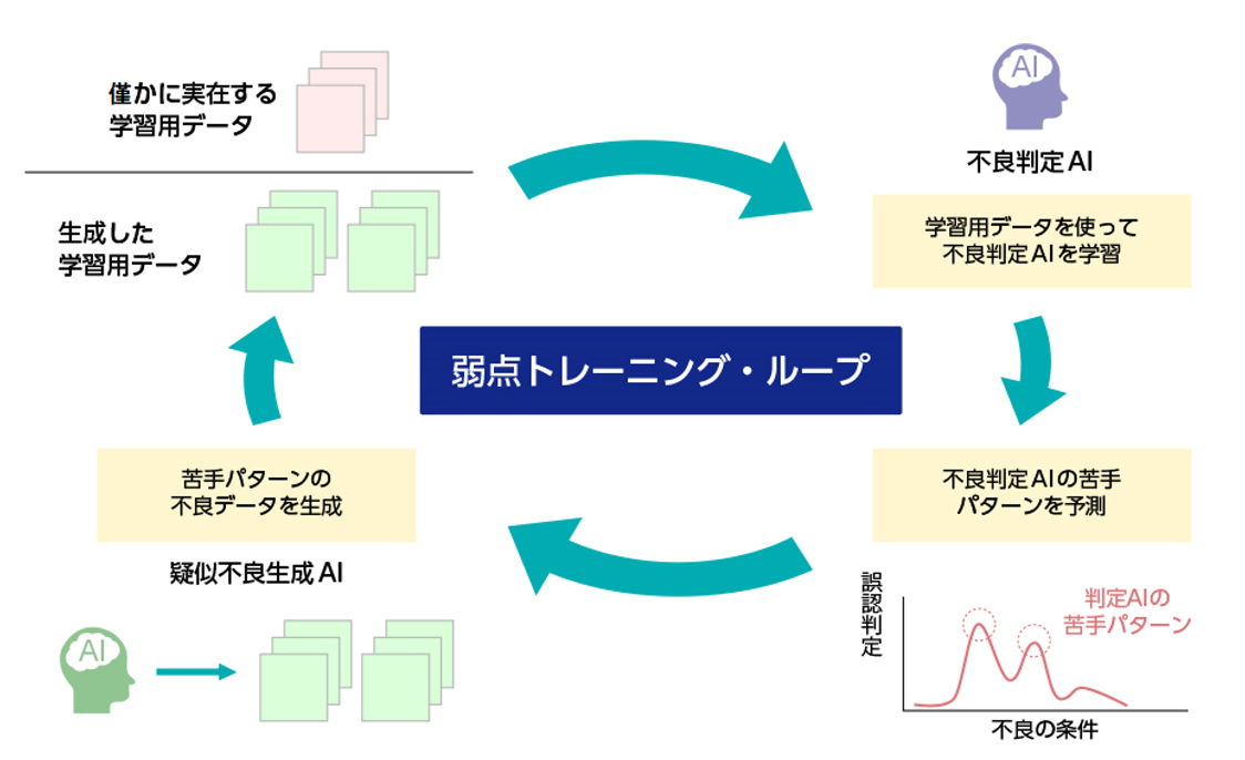 不良判定AIは、ごく僅かに実在する不良データを用いて学習を開始します。次にこの判定結果を分析し、不良判定AIが苦手とするパターンを予測します。そして、予測したパターンの不良データを疑似不良生成AIが作り出し、そのデータを使って不良判定AIが再学習します。このループを繰り返すことで、不良判定AIの苦手パターンを克服させ、ごく僅かな学習データから熟練作業員に匹敵する不良判定AIの開発が可能になります。この一連の苦手を克服するための学習ループを、弱点トレーニング・ループと呼んでいます。