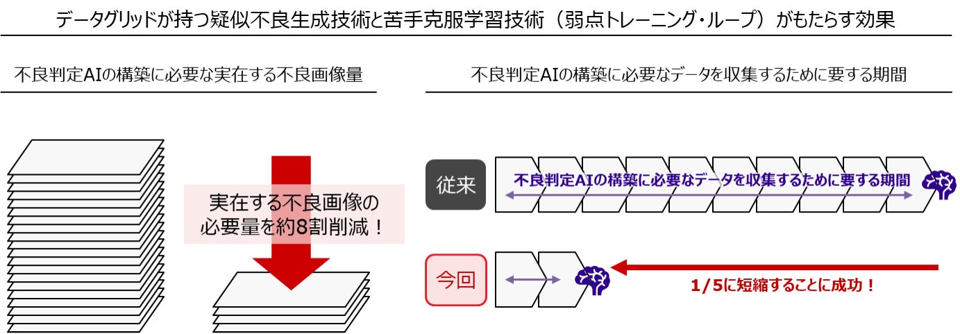 さらに、工業製品Aの疑似不良画像を使い、データグリッドが持つ疑似不良生成技術と苦手克服学習技術(弱点トレーニング・ループ)の不良判定AIの開発高速化に対する効果検証を行いました。その結果、データグリッドが持つ2つの技術を使うことで、実在する不良画像の必要量を約8割削減することが可能になり、それに伴ってデータを収集するために要する期間を1/5に減らすことが可能であることがわかりました。