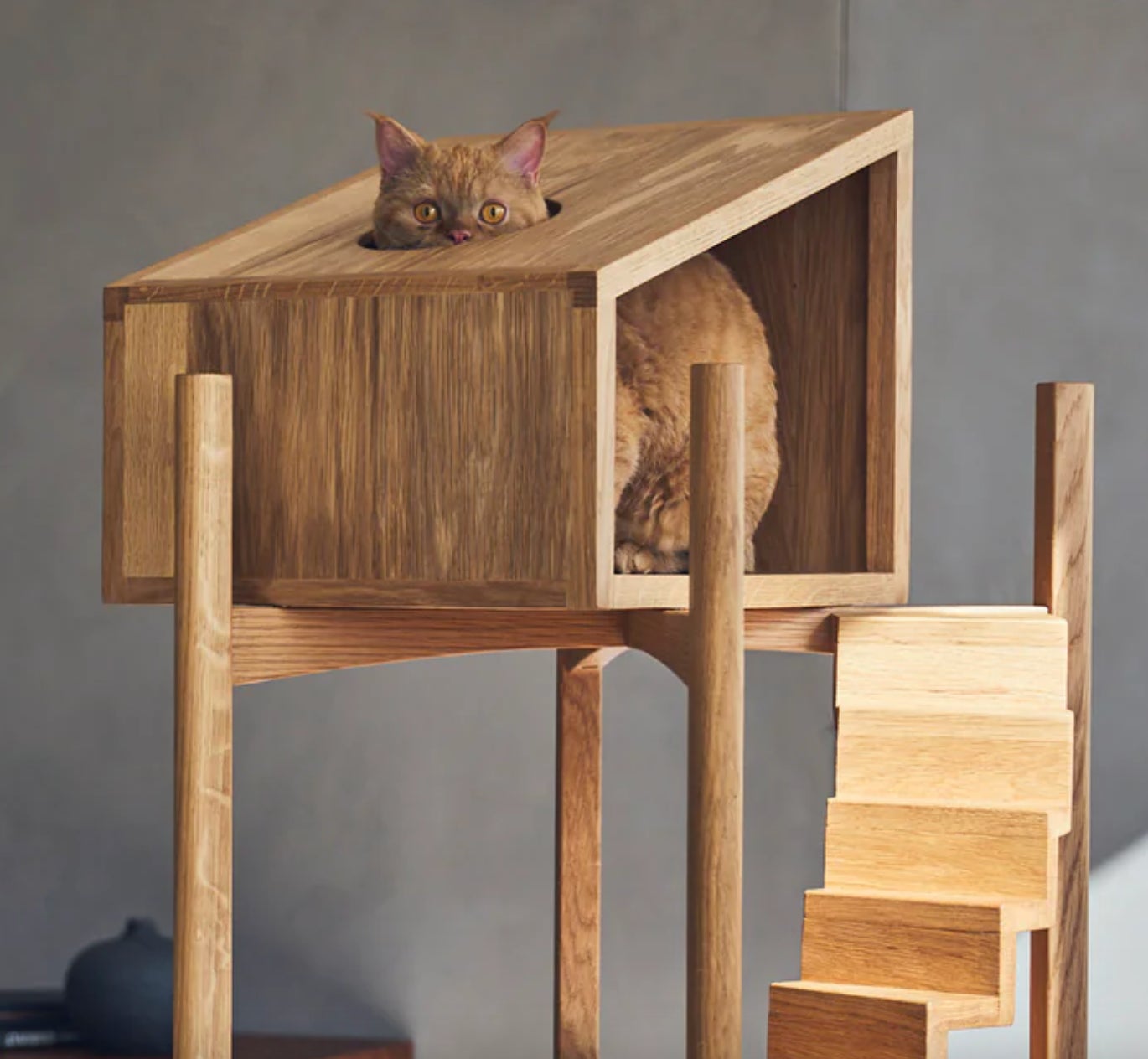 「大切な家族の猫のために」インテリアにも馴染むこだわりのキャットツリーハウスがで きました。 猫にとっても心地よく、飼い主にとっても見るだけで気分が上がる美しいデザ イン。耐久性‧希少性も高く、美しい木目のナラ材を使用しており、高い技術を持つ職人 が一つ一つ手作業で丁寧に仕上げています。