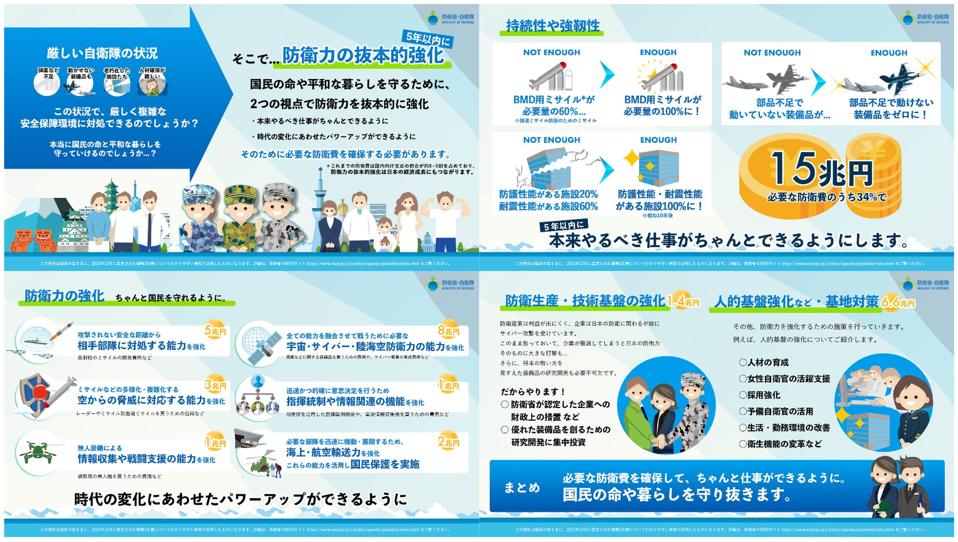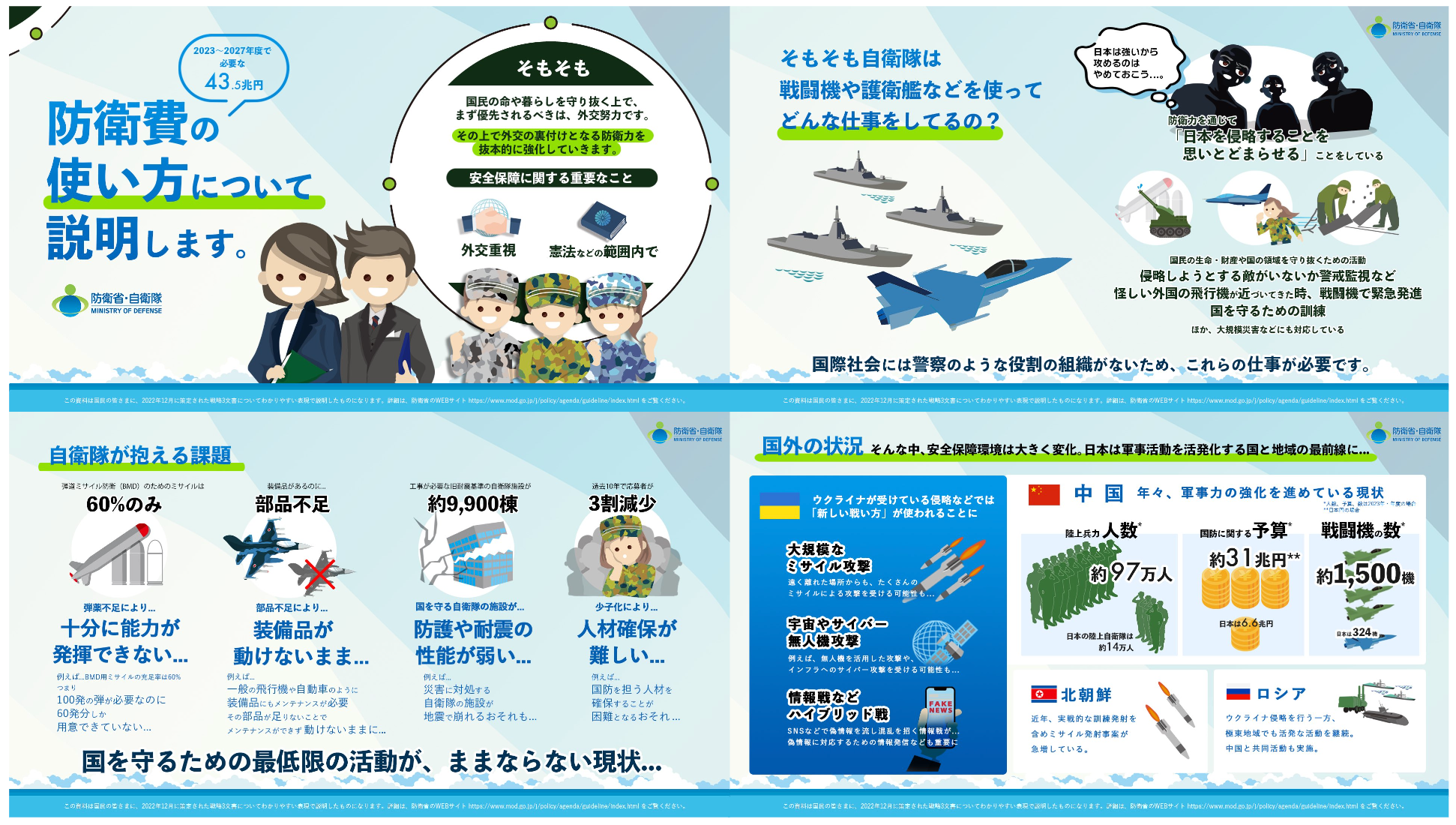 ・昨年12月に策定された「国家安全保障戦略、国家防衛戦略、防衛力整備計画」とそられに関連する参考資料等、合計約370ページの主要なポイントを8枚のグラフィカルサマリーに分かりやすくまとめました。
