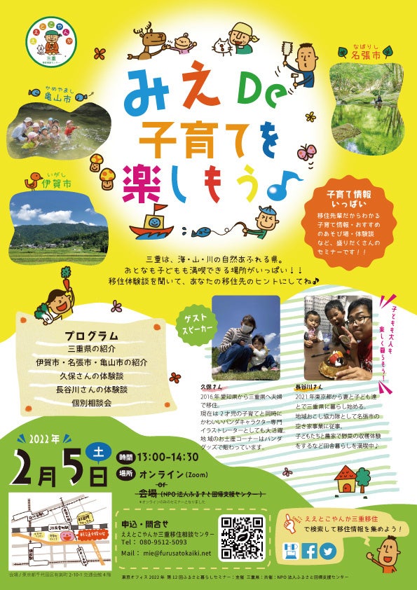 また、定期的に三重県への移住を考えている方などを対象とした移住セミナーを実施しています。直近では2月5日(土)13:00~「ええとこやんか三重移住セミナー ~みえDe子育て楽しもう♪~」を開催します。移住セミナーは、特に都市部等にお住まいで、移住を検討されている方に関心が高い「就職」「子育て」などをテーマに取り上げ、座談会や個別相談等を通じて、三重県への移住についてより関心を持っていただくことを目指して実施していますので、三重県にご興味のある方はぜひご参加ください。