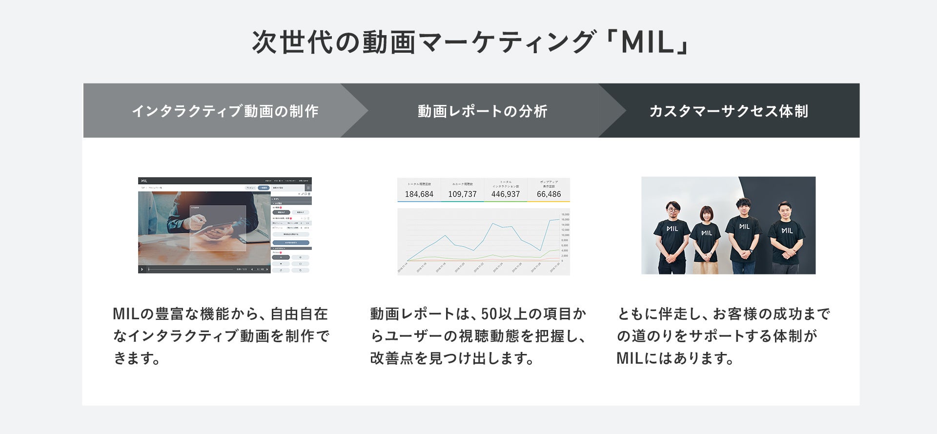 MIL株式会社は「あたらしいふつうを世界でつくる」をミッションとして掲げ、インタラクティブ動画編集プラットフォーム「MIL」の開発・提供を通じて、新しい視聴体験と顧客の成功を探求することを目指しています。今後も各社様の事業課題に合わせ、インタラクティブ動画のプロフェッショナルが、企画・構成、編集、広告運用、分析レポートに至るまで、包括的なサポートをご提供してまいります。