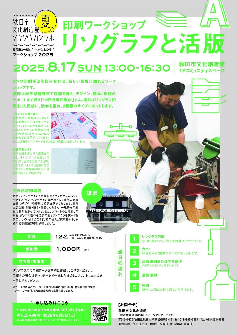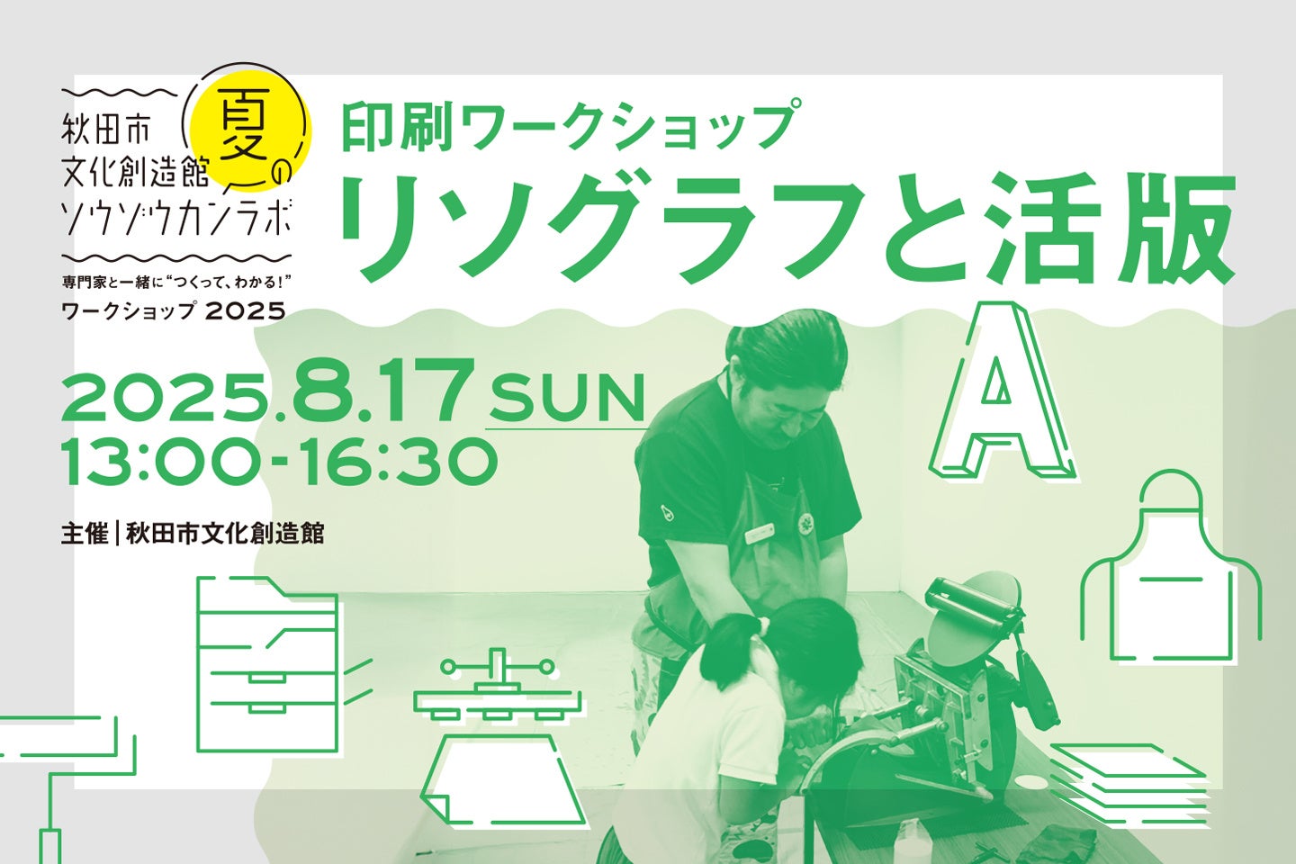秋田市文化創造館(秋田市千秋明徳町、館長:西原珉)は、専門家と一緒に"つくって、わかる!"ワークショップの一環として、印刷ワークショップ「リソグラフと活版」を8月17日(日)に開催します。