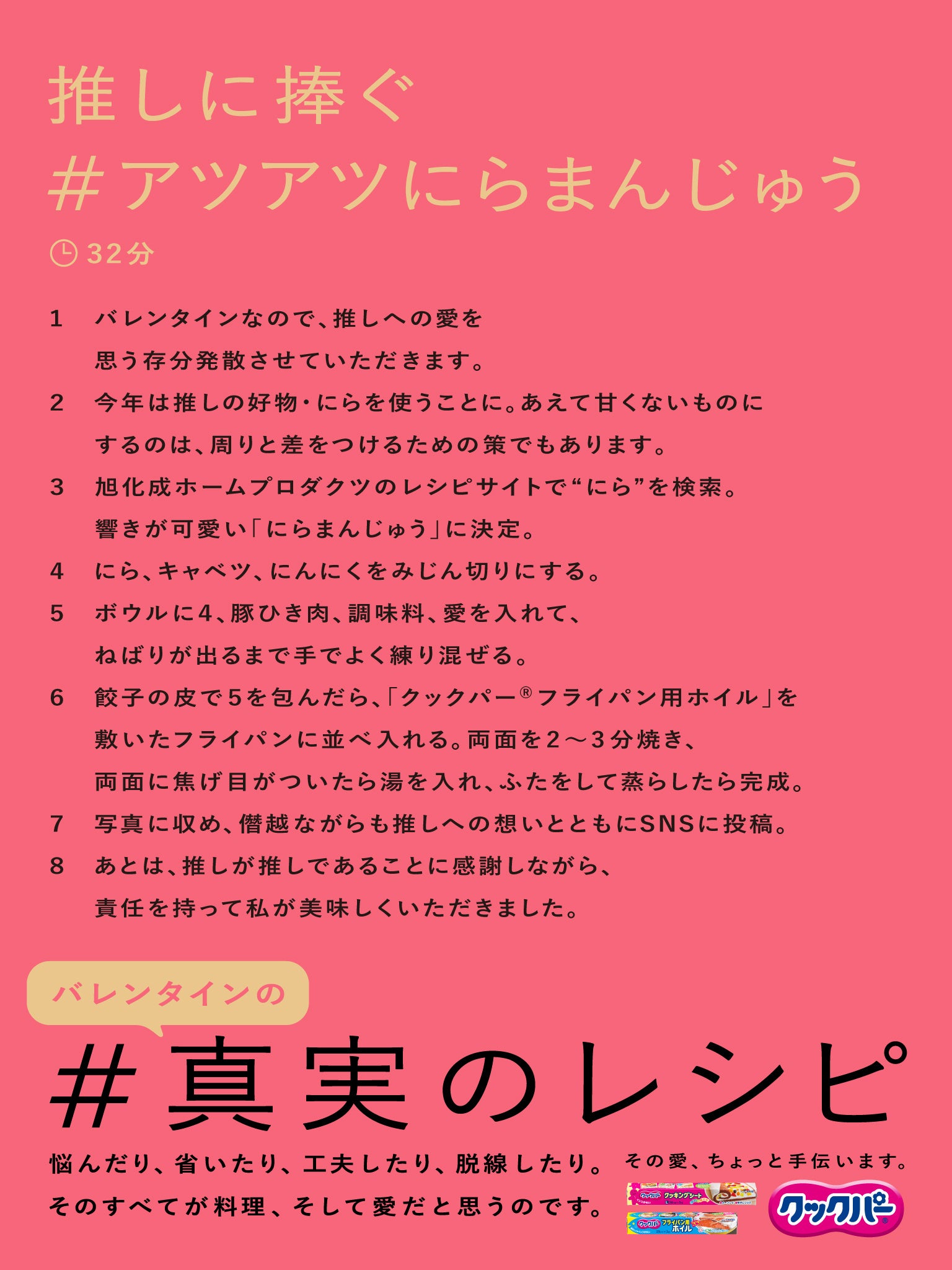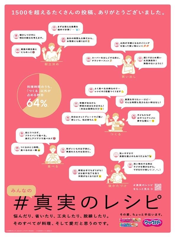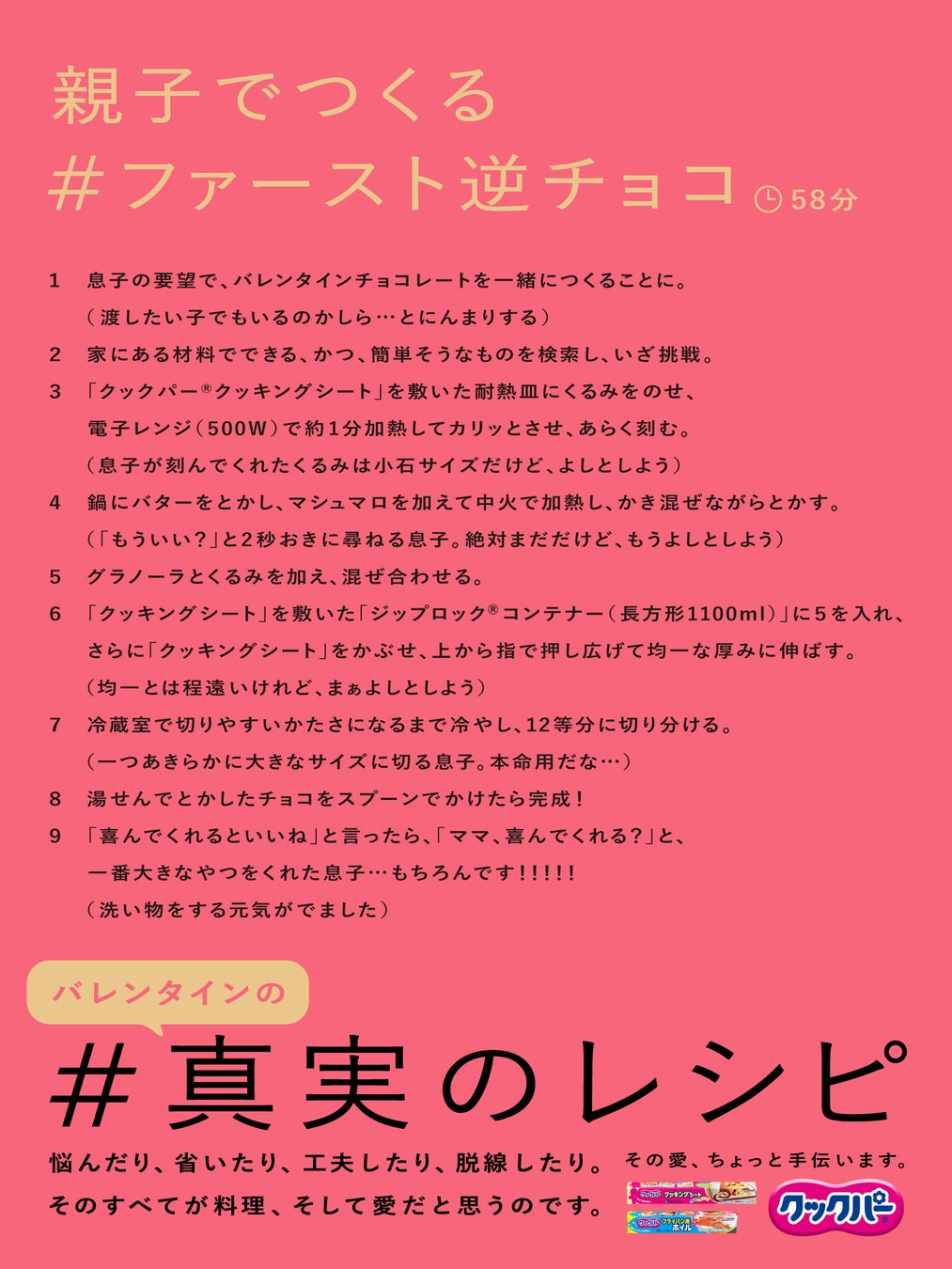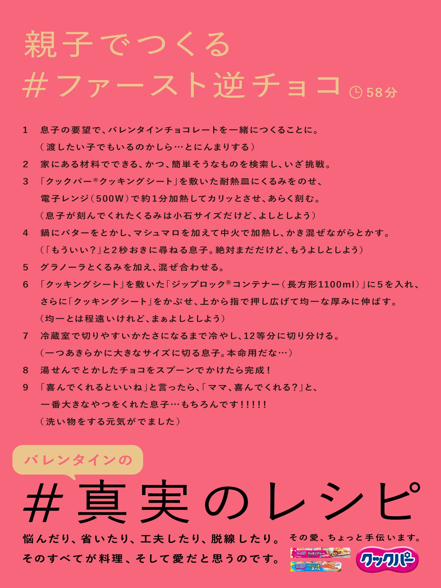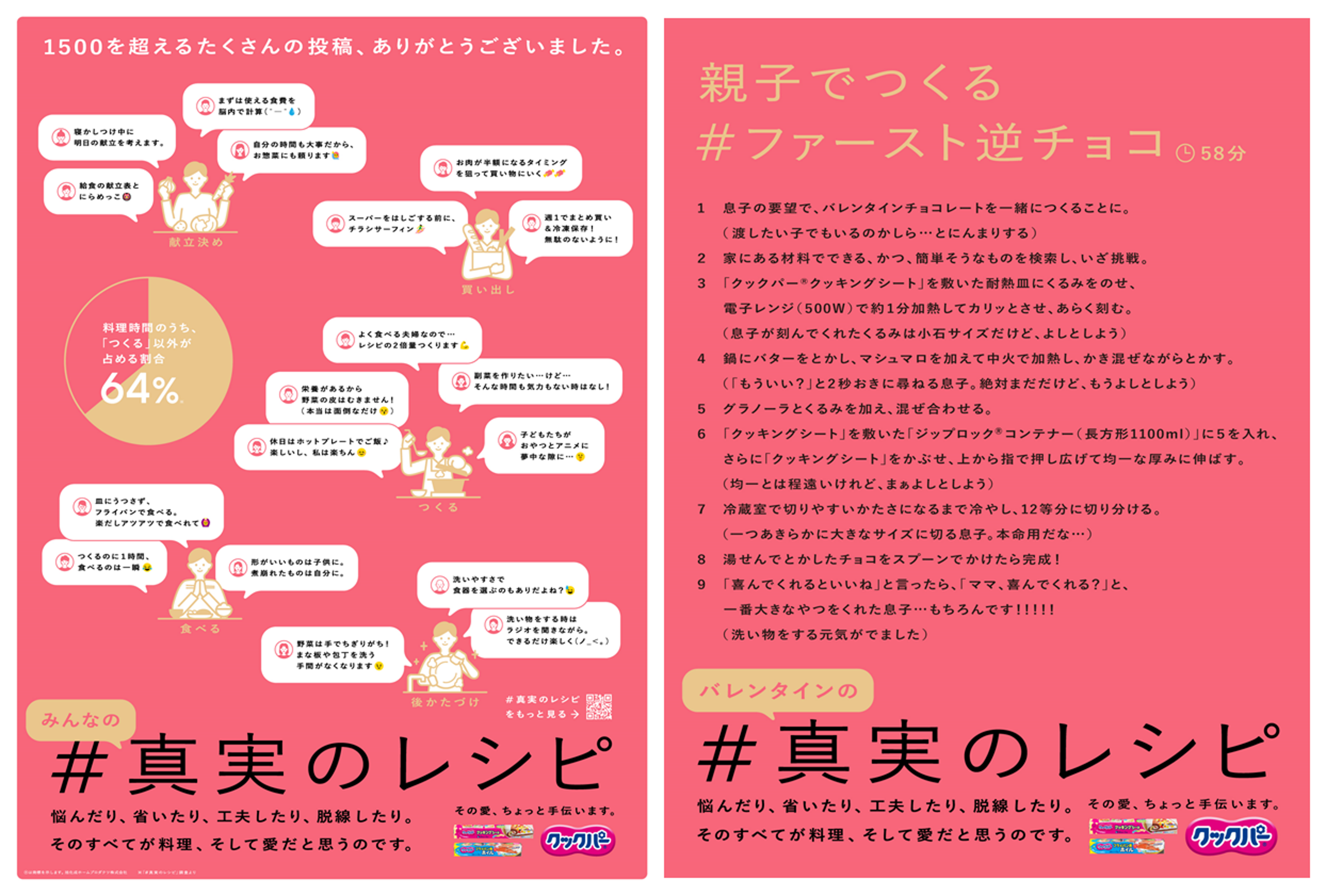 旭化成ホームプロダクツ株式会社(本社:東京都千代田区、社長:澤江潔)のクックパー®ブランドは、料理する本人でさえ気づいていない、レシピの行間に隠された、無意識の愛や想いを可視化する試みで昨年話題を呼んだ「#真実のレシピ」において、SNSに寄せられた1500人の声を集約した「みんなの#真実のレシピ」を2022年2月10日(木)より公開いたします。また、バレンタインに向けて、様々な愛のカタチにまつわるエピソードをまとめた「バレンタインも#真実のレシピ」も合わせて公式Twitterにて公開いたします。