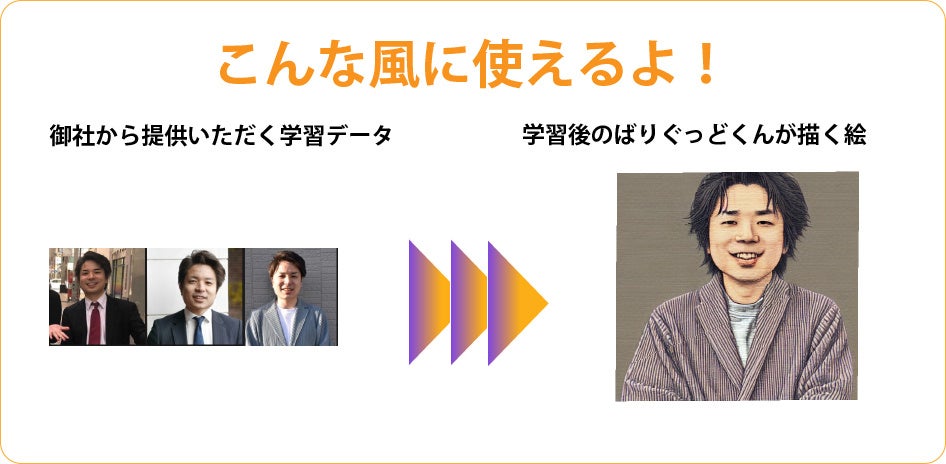 つまり、御社より同意を頂いた上で、御社が権利を有する画像を頂き、それをばりぐっどくんに学習させれば、『あなた』もしくは『御社のキャラクター』を、ばりぐっどくんが覚え、多くのユーザー様が、まさに『あなた』もしくは『御社のキャラクター』でお絵描きして遊べるのではないか、と。 いかがでしょうか。