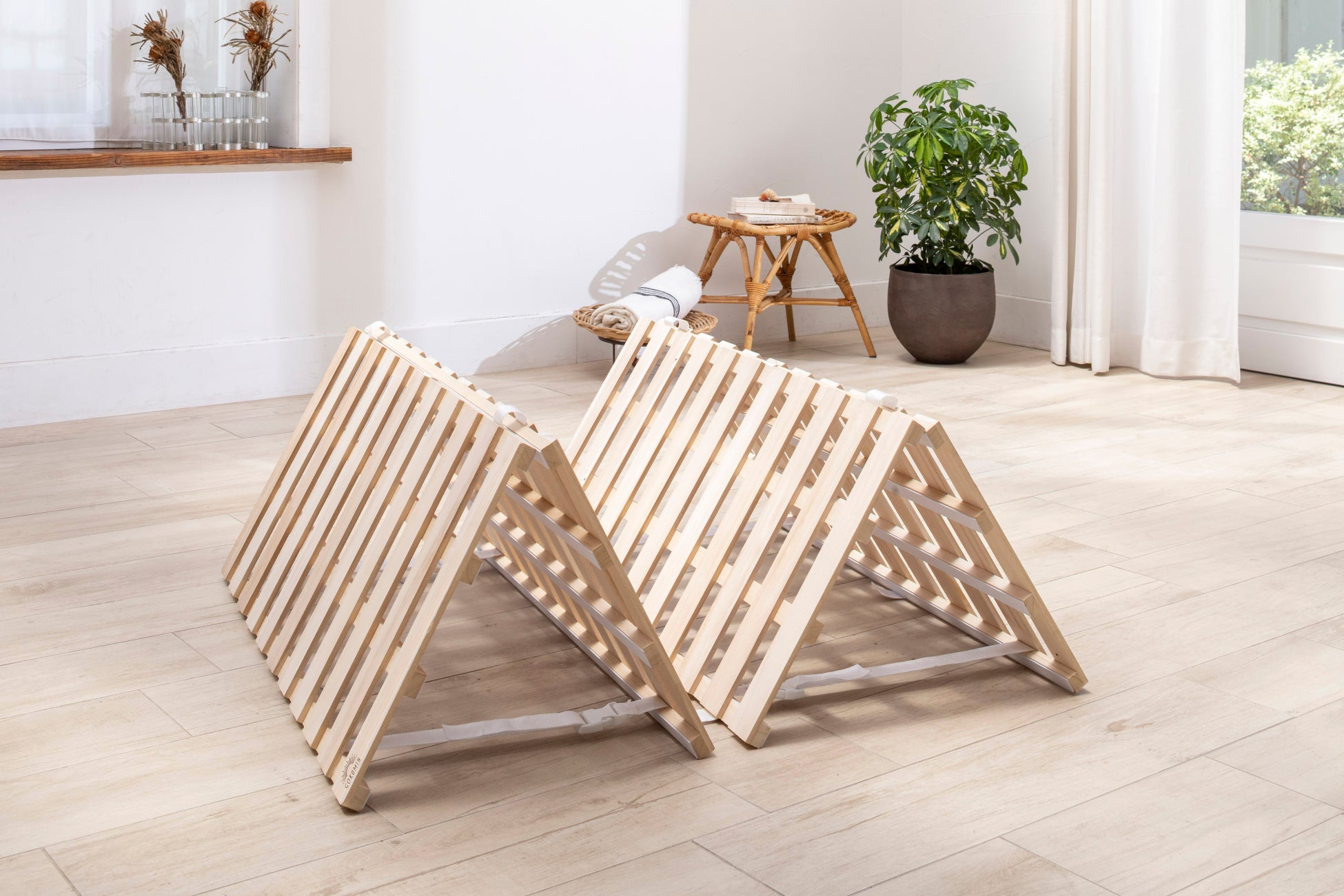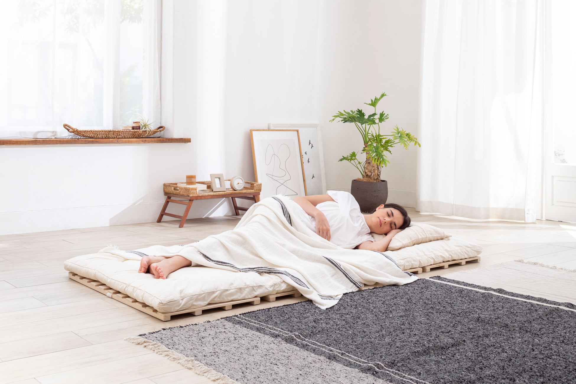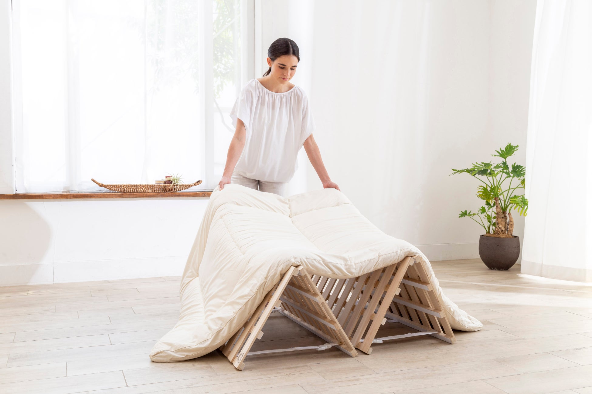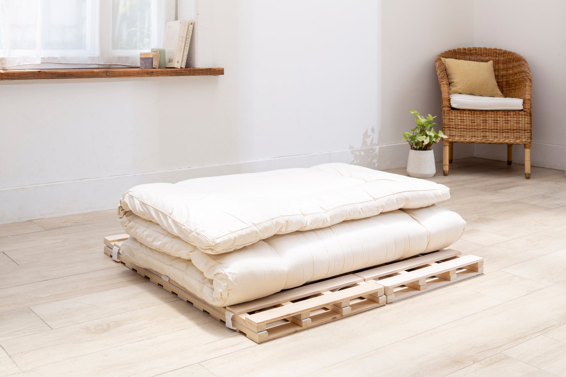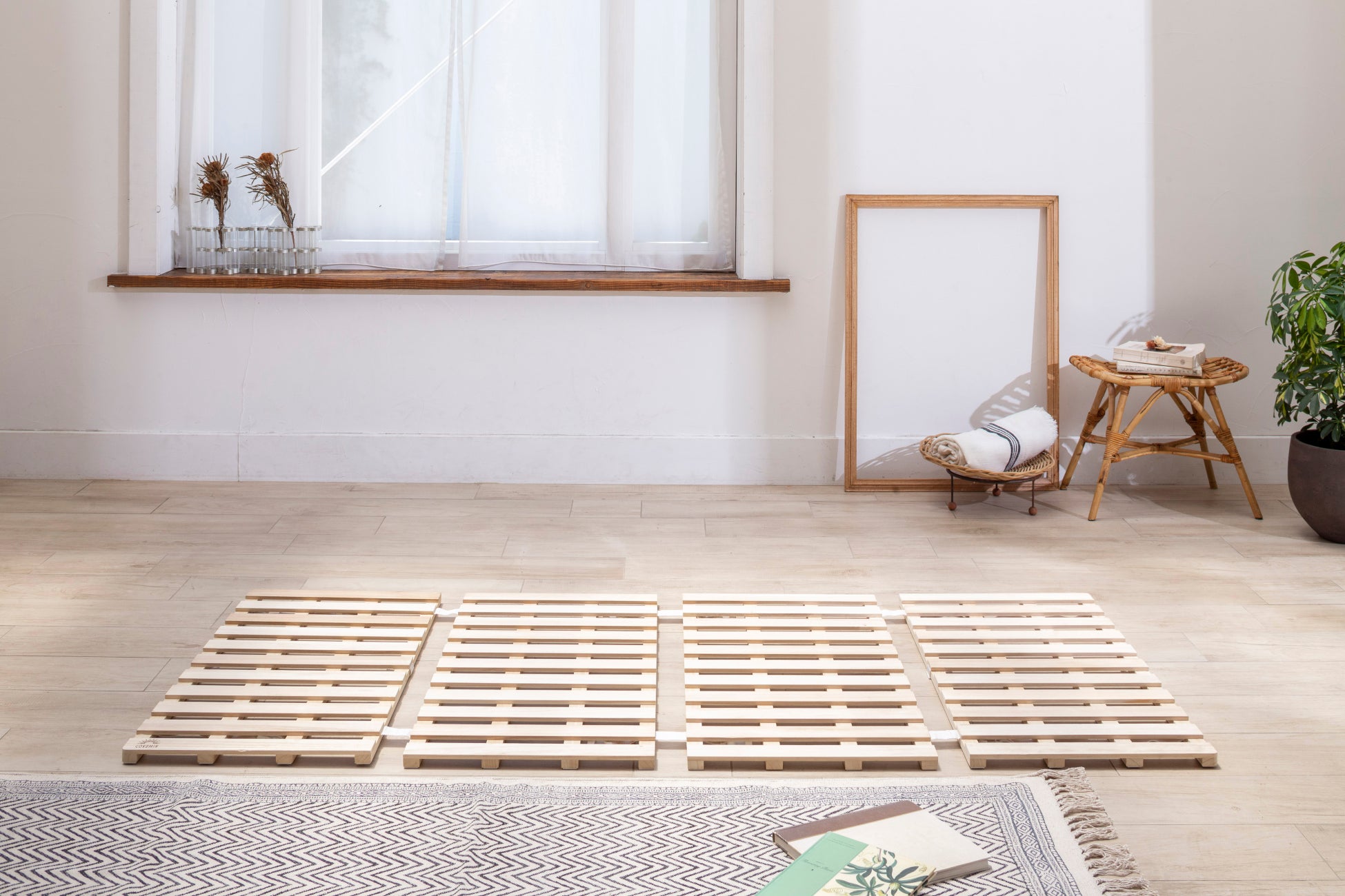 1.寝具を湿気のトラブルから守る通気性抜群のすのこマット。床に布団やマットレスを直に置くのではなく、すのこマットを1枚挟むだけで空気の通り道ができ通気性が改善、カビやダニ、冬の結露の発生も防ぎます。すのこの素材には調湿効果をはじめ、防虫・抗菌効果、断熱効果など優れた効果を持つ天然桐材を使用しています。