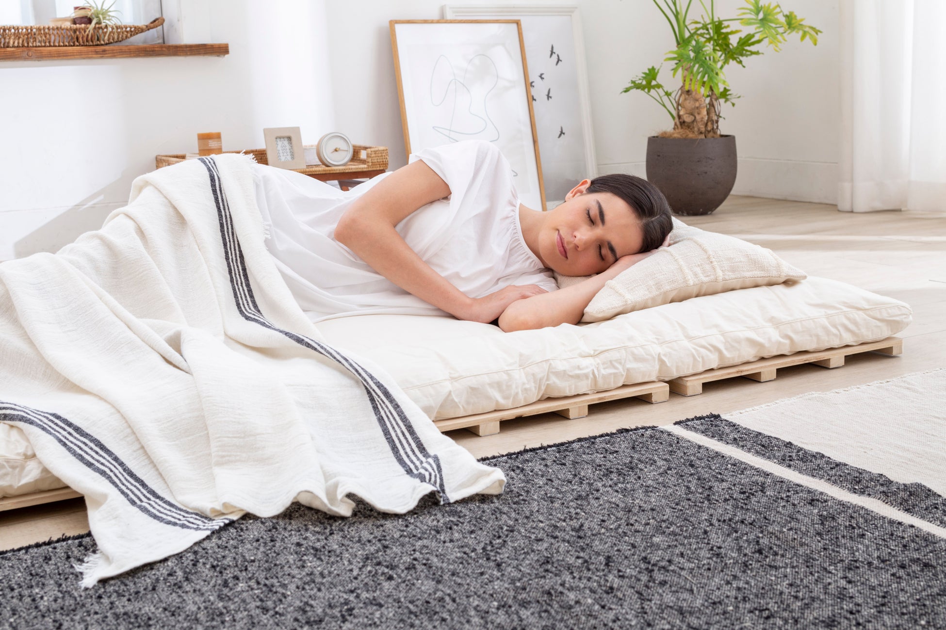 4.床との接地面には全面EVAクッション材を接着しており、安定した寝心地を叶える滑り止め機能と、床への傷防止の機能を含んでいます。ISO9001認証、 OEKO-TEX®認証など多数の国際規格に適合した工場で、ひとつひとつ丁寧に作られ、国内検査機関の品質調査もクリア。安心してお使いいただける低ホルムアルデヒド仕様です。