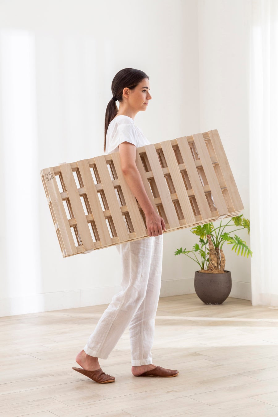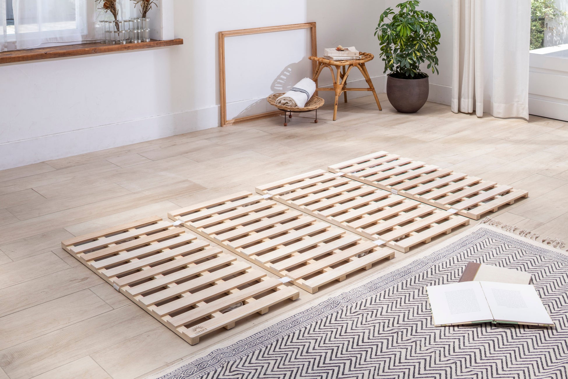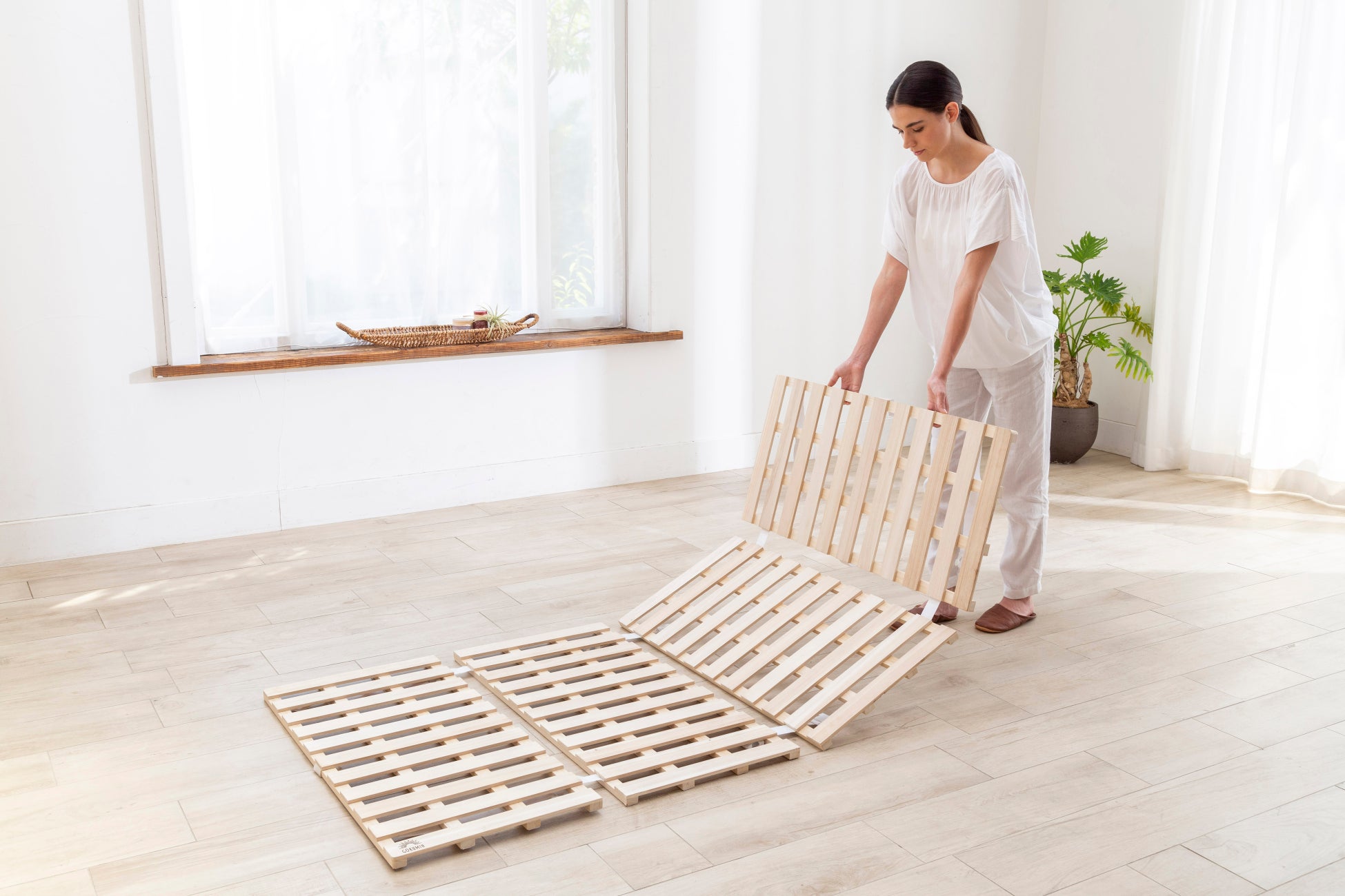 3.すのこの厚みや素材、構造の細部までこだわり、強度アップを図った頑丈設計により、静止耐荷重も200kgまで耐えうる優れた耐久性を実現。さらに女性やお年寄りでもさっと敷けて、ラクに運べる重さ5.6kgという軽量設計。使わない時は四つ折りに畳めば46×97×10cmとスリムに収納可能。4つ折りに畳んだ状態で固定するのに便利な、マジックテープ付きです。