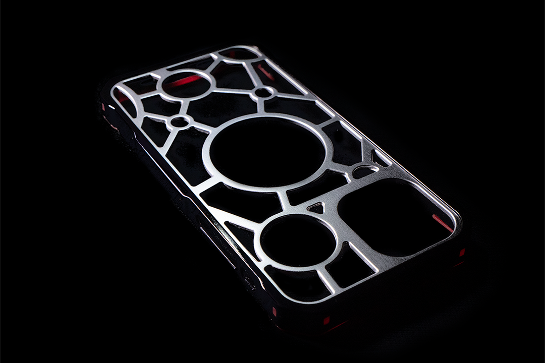 上面と下面を、時間をかけて削り出し、手作業で磨き上げることで、エンジンの模様のプレートを作成。