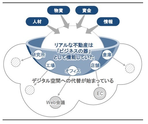 - 企業活動の一部は、その場を不動産からデジタル空間へ移行し、将来はリアルとデジタルが融合して機能発揮