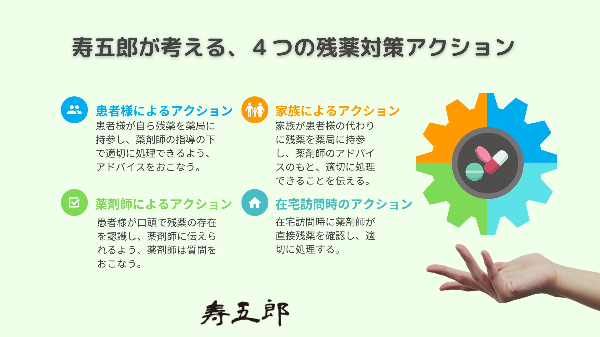 寿五郎は残薬問題対策の啓蒙活動を通じ、薬剤師が直接これらの問題に関与し、残薬削減効果を上げられると考えています。
