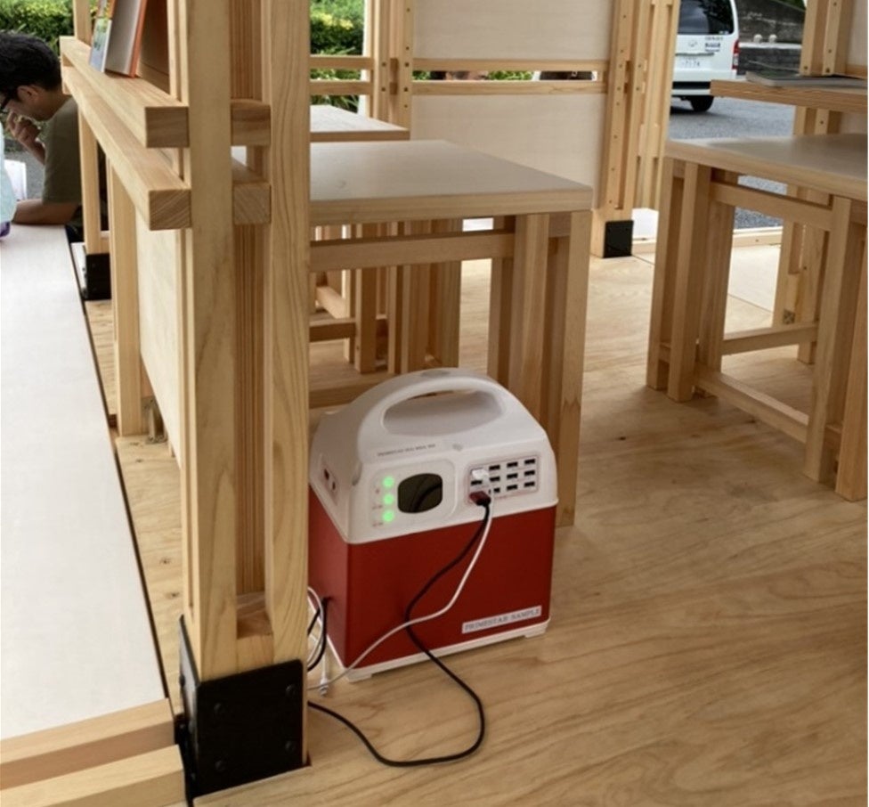 当社では、社会実証拠点内に『可搬型リチウムイオン蓄電池・HUGシリーズ』を複数台設置し、PCやスマートフォンに対して給電を行いました。