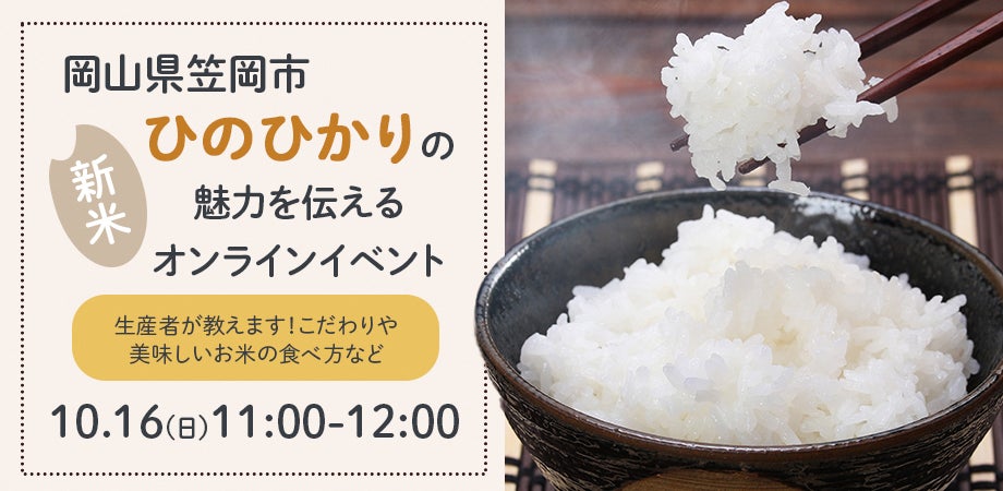 岡山県笠岡市(笠岡市中央町1番地1 市長:小林嘉文)は、関係人口創出プロジェクトの一環として、ふるさと納税品の人気返礼品・新米「ひのひかり」の魅力を伝えるオンラインイベントを10月16日(日)に開催いたします。イベント内では、農家さんから直接聞ける米作りのこだわり、美味しいお米の炊き方などを実演。また、フードロス削減や食糧自給率の向上、耕作放棄地を減らすための取り組みとして、ひのひかりを使った米粉をご紹介。米粉開発のストーリーや日本の米粉・農家の現状など、今一度お米について皆様へ知っていただければと思っています。食べておいしい、知っておもしろい、お米をもっと好きになるイベントです。