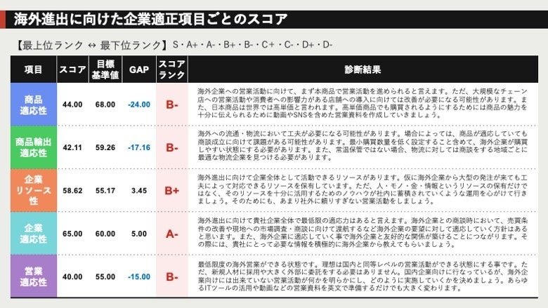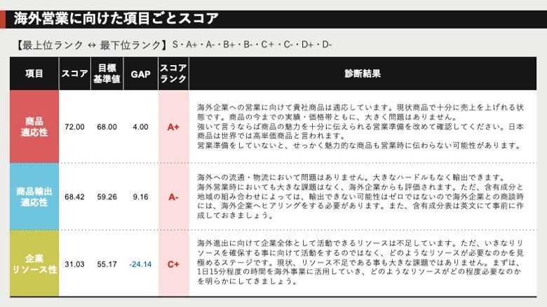 また、診断レポートの結果は直接海外進出に対して活かすだけでなく、事業をサポートする外部企業や社内に共有することで、海外進出における説明資料としてもご活用いただけます。