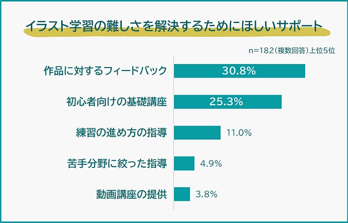 「イラスト学習の難しさを解決するためにほしいサポート」の1位は「作品に対するフィードバック(30.8%)」、2位は「初心者向けの基礎講座(25.3%)」でした。
