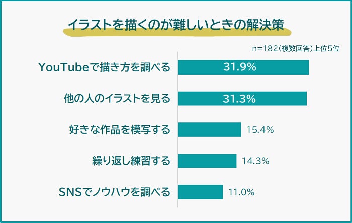 悩みの解決策としてトップにあがったYouTube動画は、イラスト学習においてとても有用な手段です。実際の動きを映像で確認することは技術習得の大きな助けになります。一方で、膨大な情報の中から自分向きのものを探すのが難しく、テクニックだけでなく「自分に合った学び方」を指導してほしいというニーズも高まっているのでしょう。