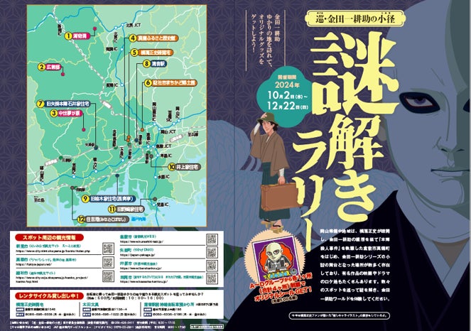 「巡・金田一耕助の小径」実行委員会は、2024年10月2日(水)から12月22日(日)まで、ミステリー作家の横溝正史が生み出した「名探偵・金田一耕助」ゆかりの地を、謎を解きながら巡る「巡・金田一耕助の小径 謎解きラリー」を岡山県内の12か所で開催しています。