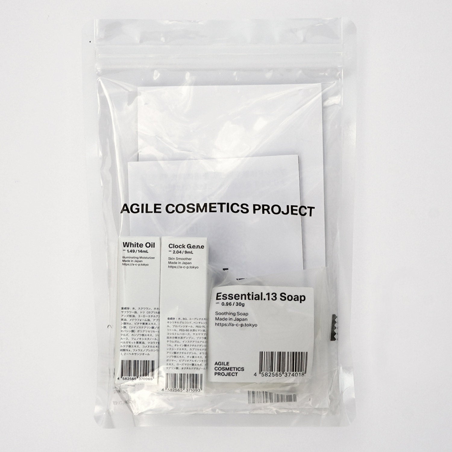 アジャイルコスメの人気製品、白いオイルと時計遺伝美容液のお試し用ミニサイズセットに、非売品のエッセンシャル13 石鹸を加えた限定セット。
